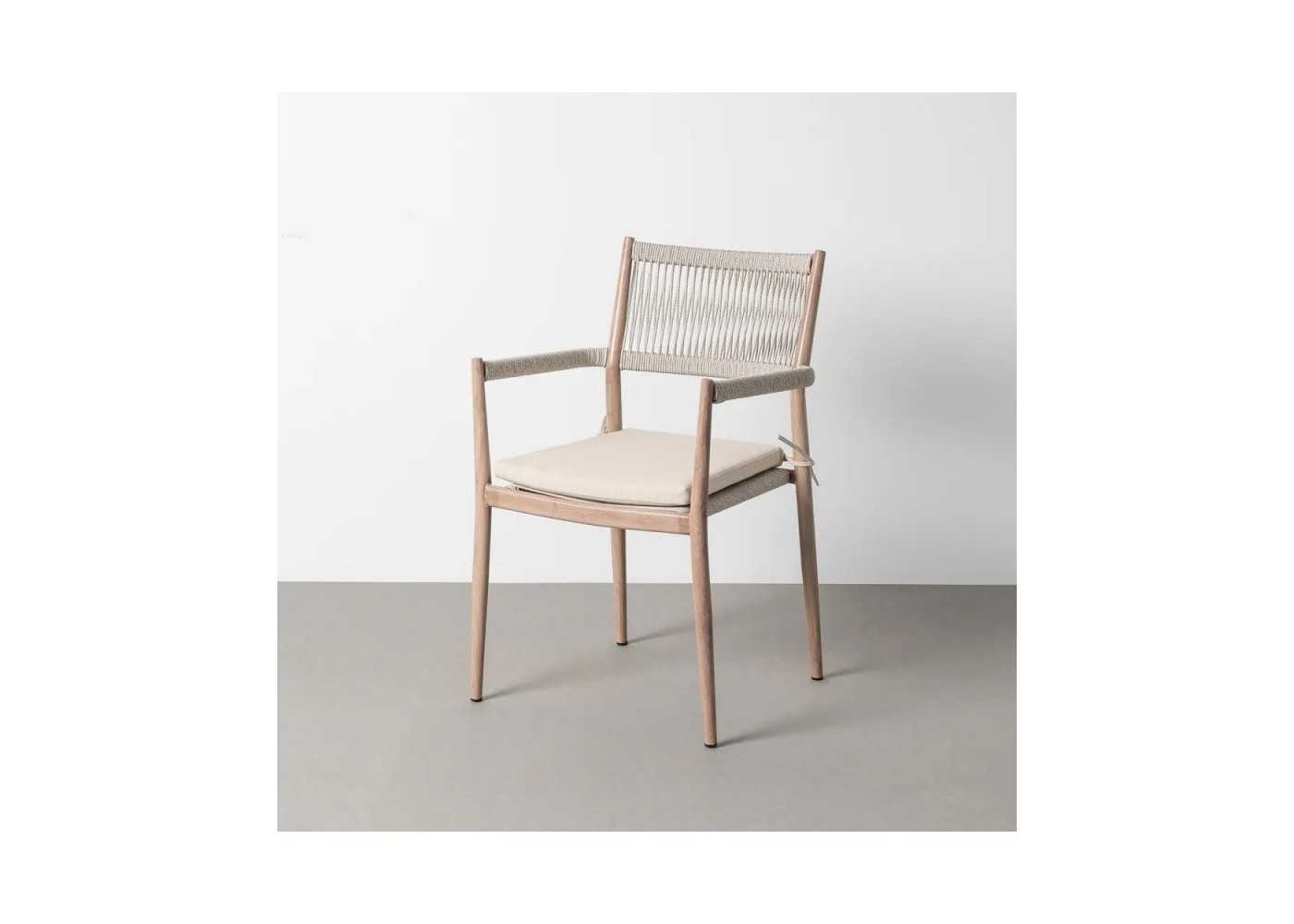 Elegant and functional outdoor chair with armrests, lacquered steel frame with PE rattan and light beige seat cushion.