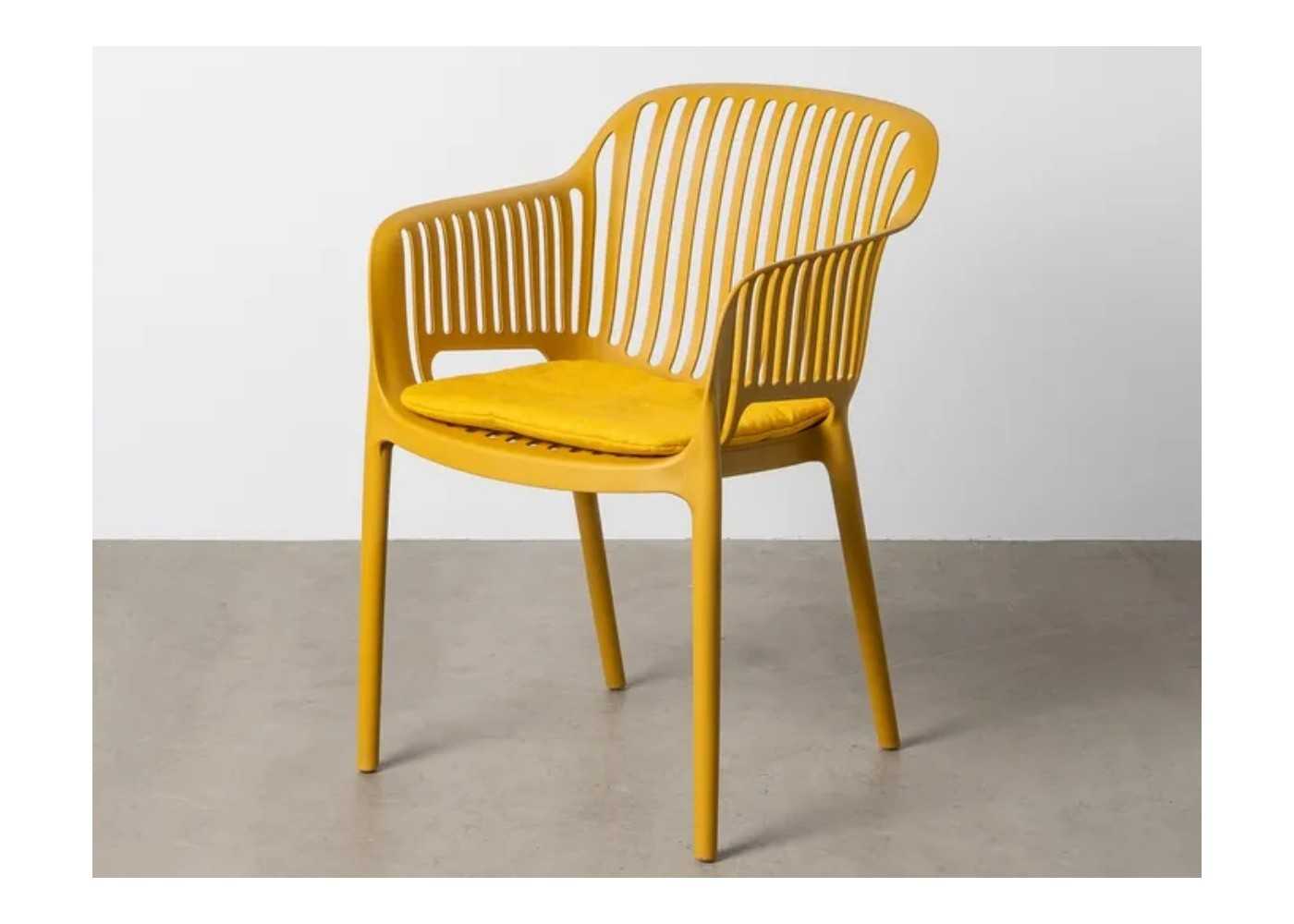 Outdoor chair with armrests, stackable, with yellow seat cushion.
