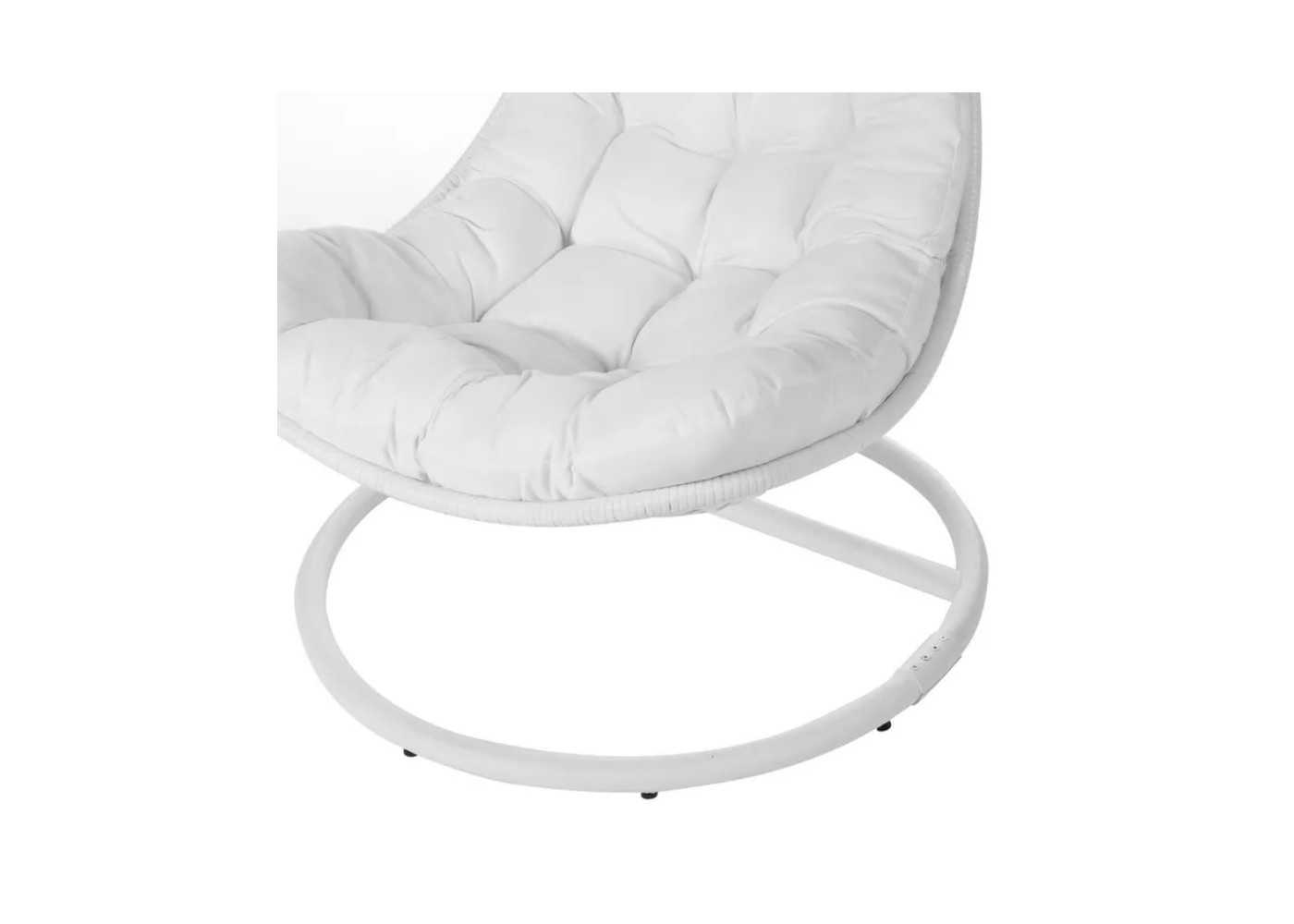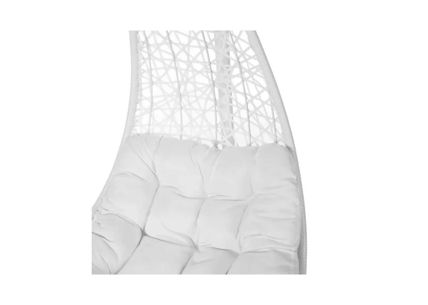 Modern outdoor hanging chair with steel mast. White lacquered steel frame with woven PE synthetic rattan and 16 cm thick seat cushion.