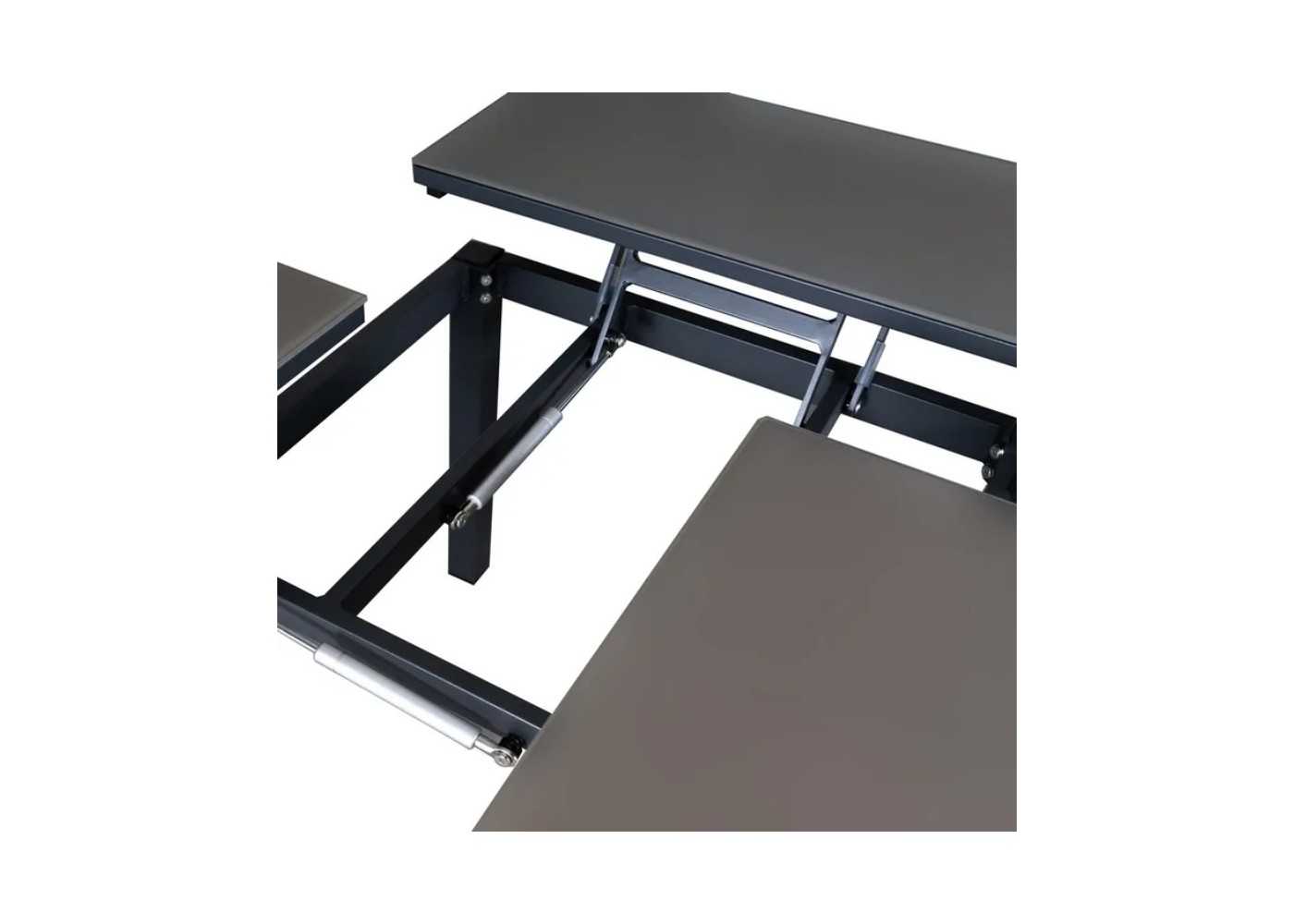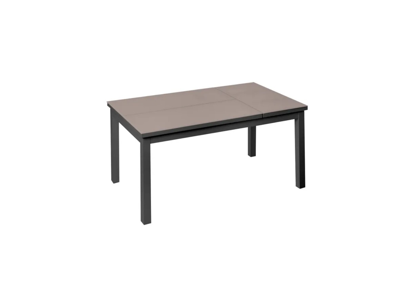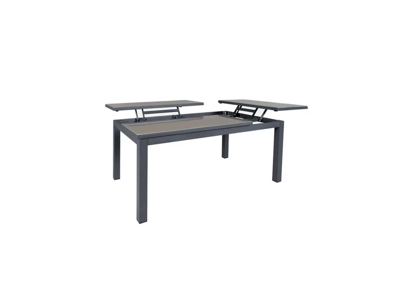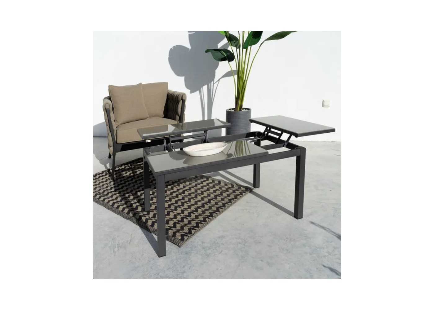 Folding outdoor coffee table with graphite-colored aluminum frame and taupe-colored tempered glass tops.