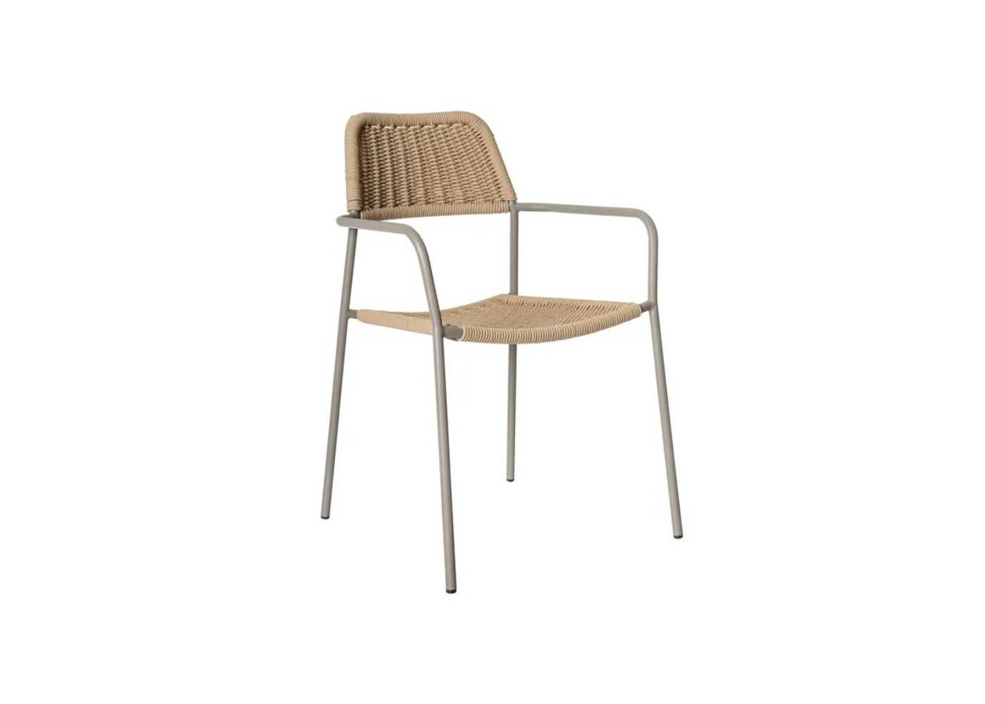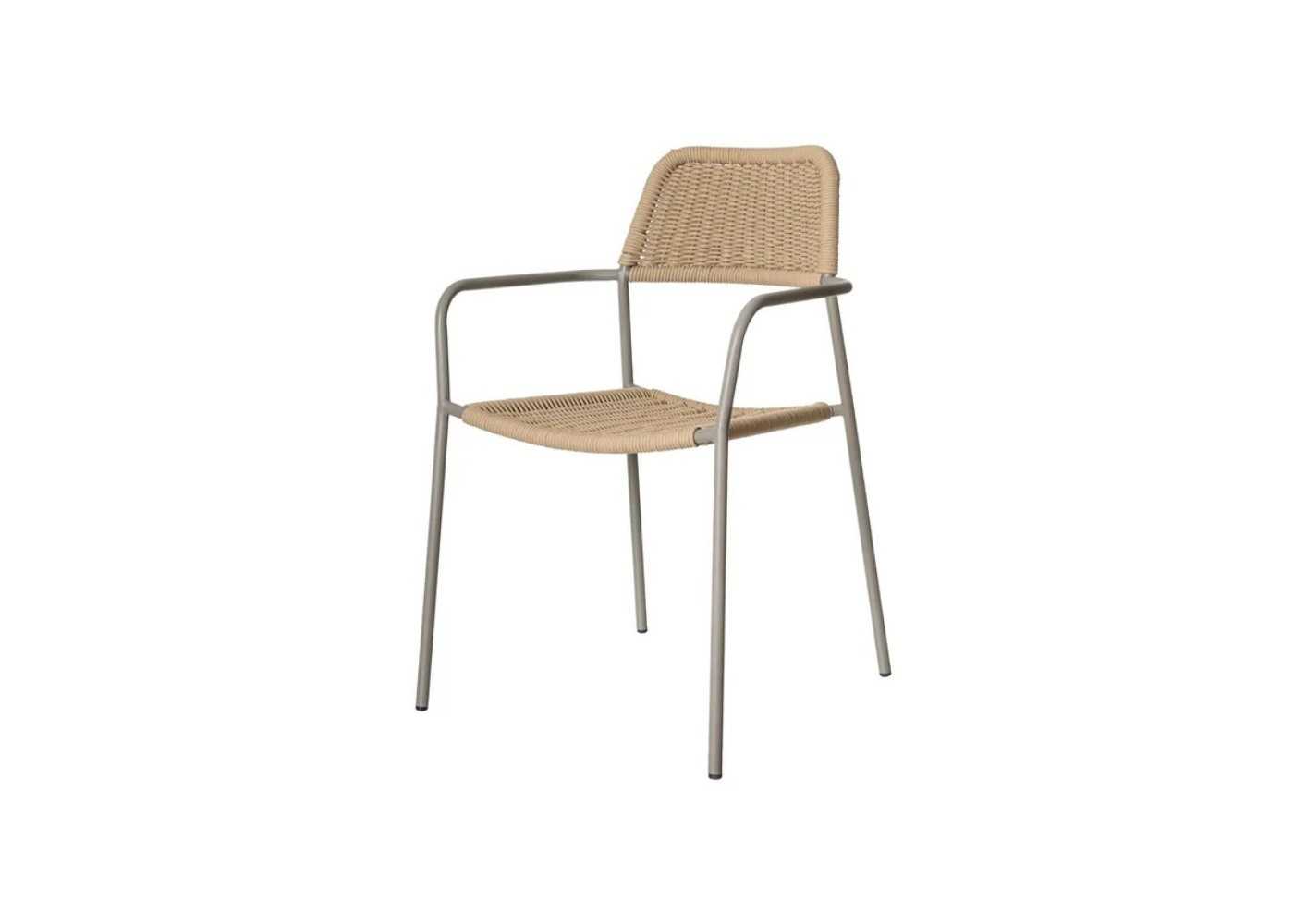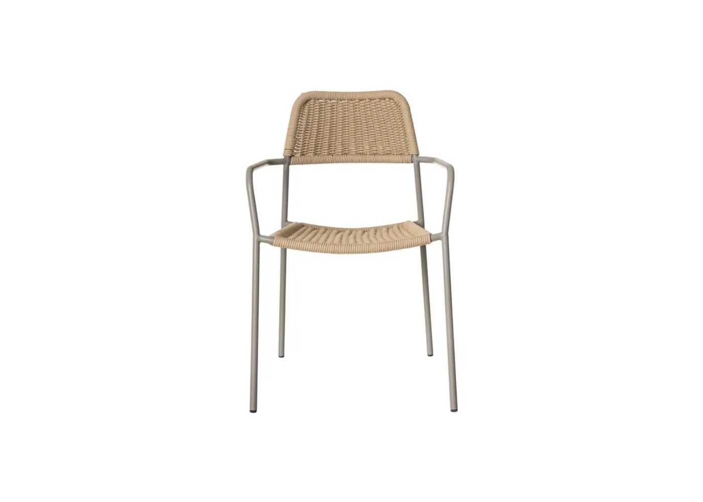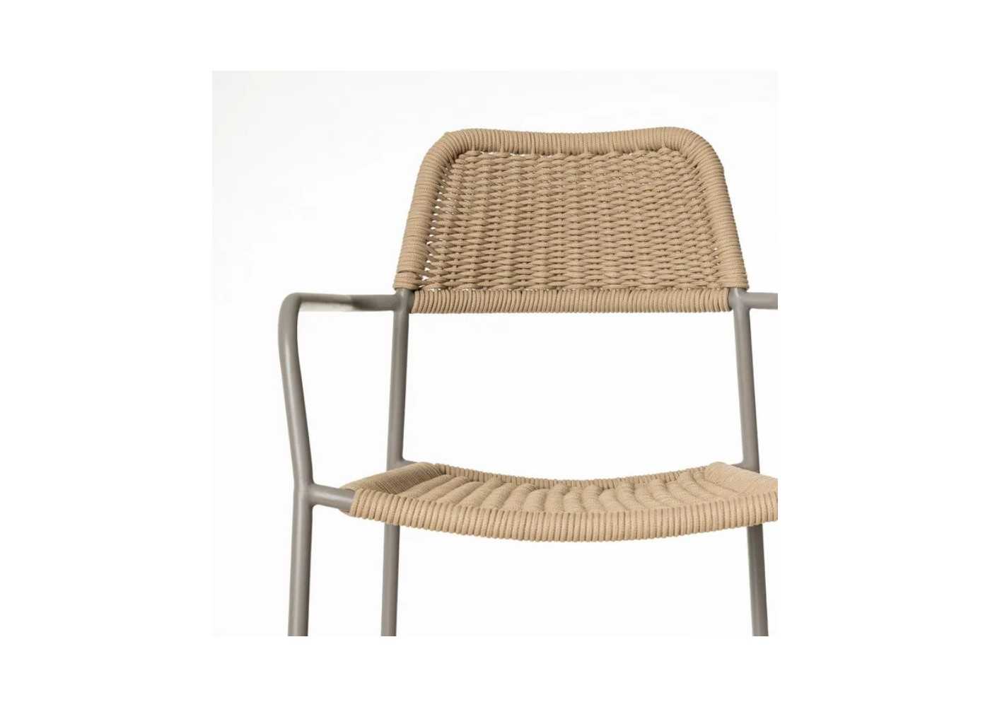 Outdoor chair with beige steel frame and seat and backrest made of natural-colored braided rope