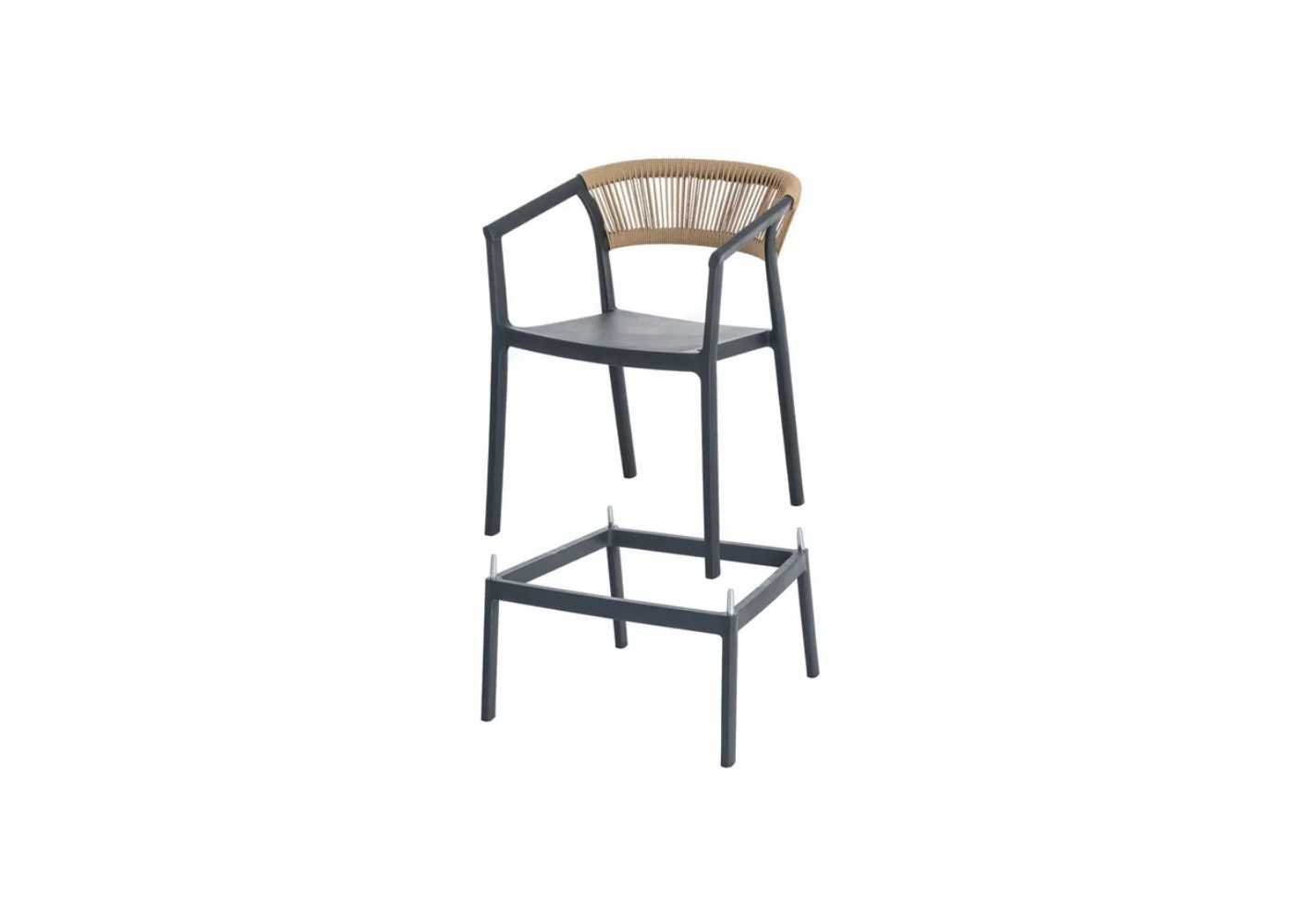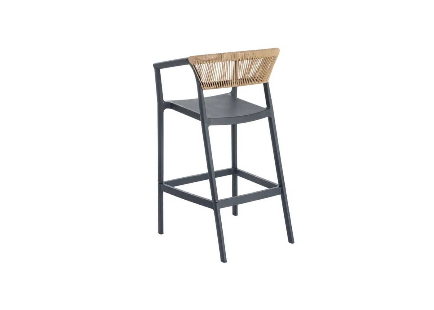 Outdoor stool/chair made of anthracite-coloured polypropylene with natural-coloured polyethylene ropes.