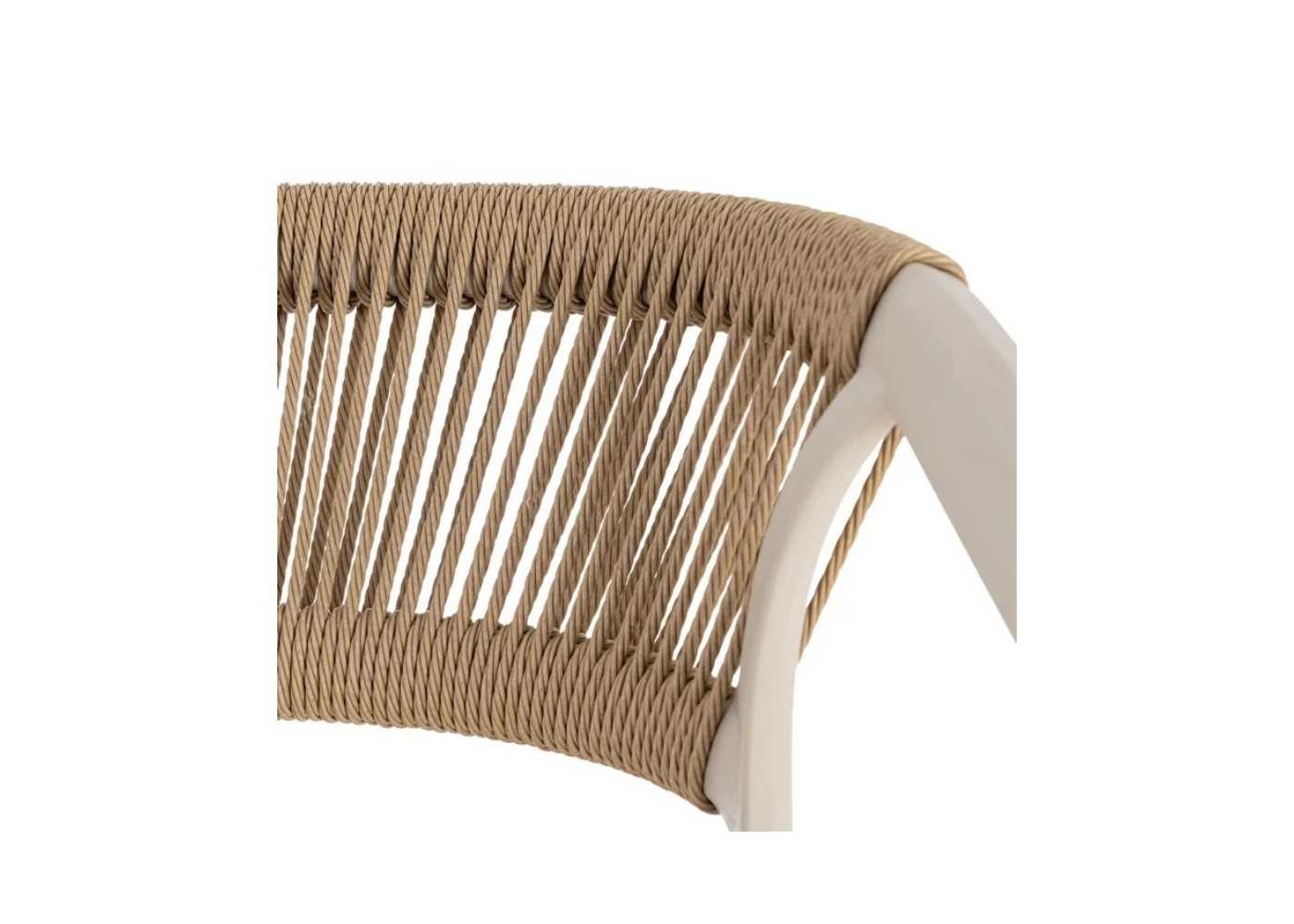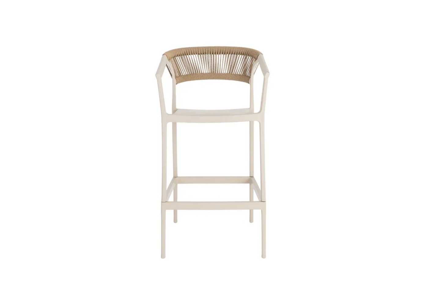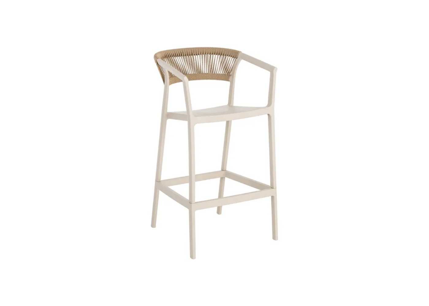 Outdoor stool/chair made of beige-coloured polypropylene with natural-coloured polyethylene ropes.