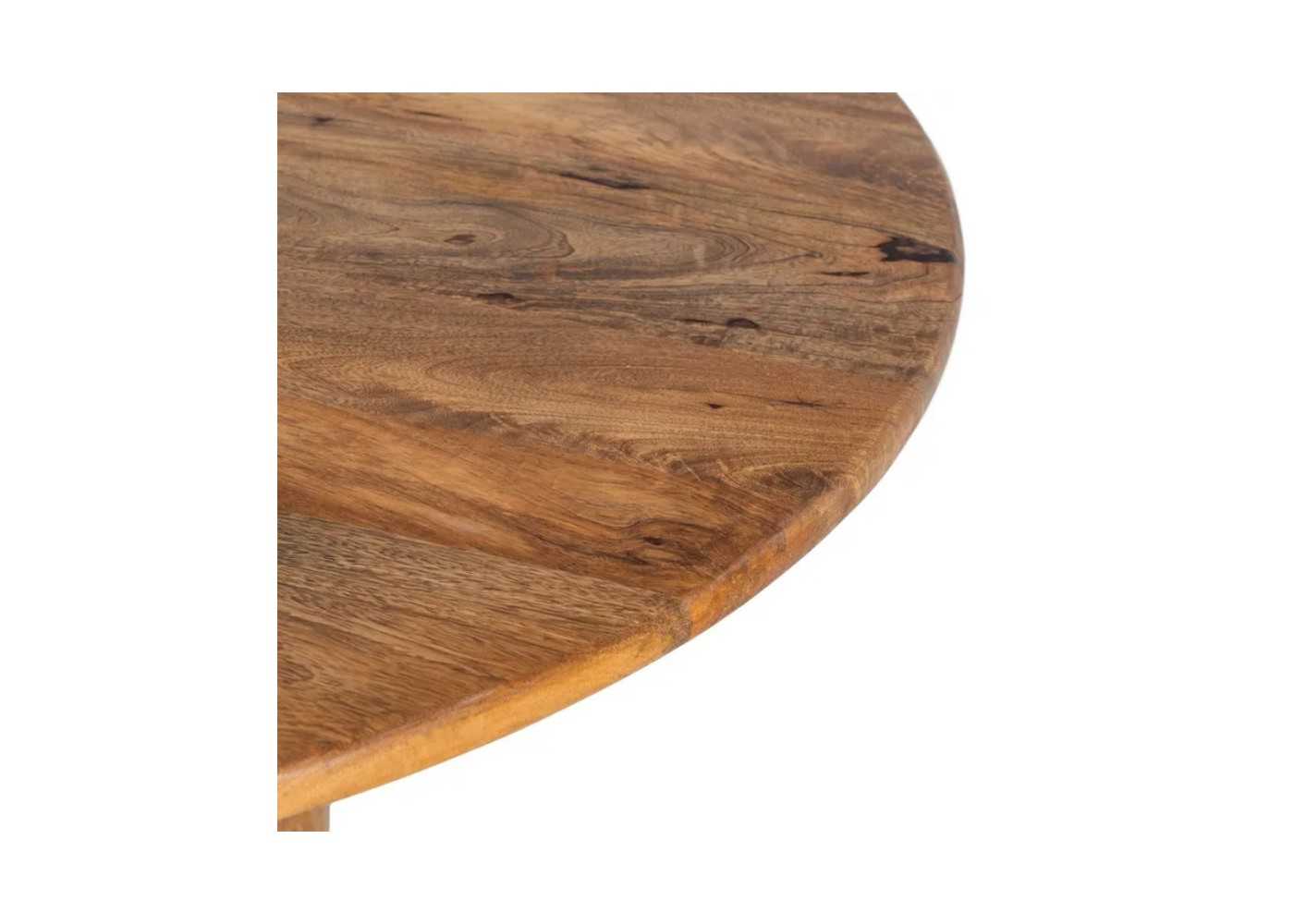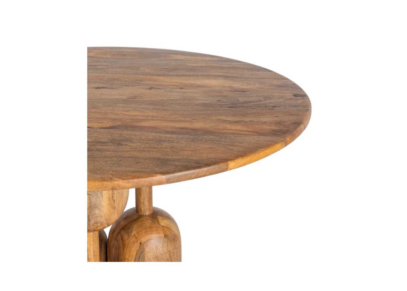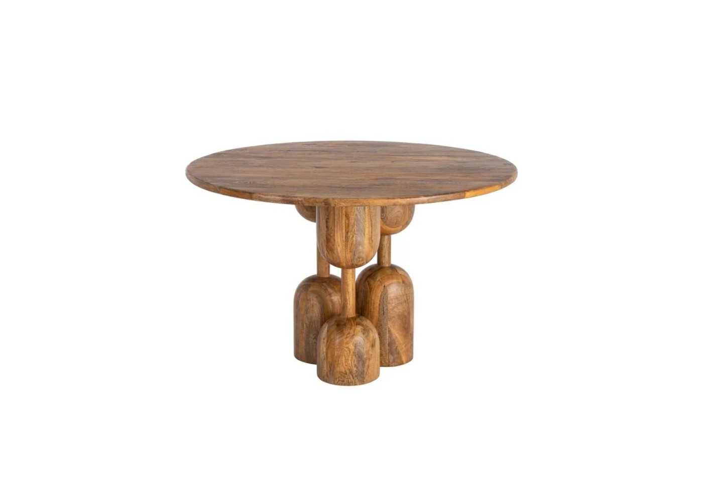 A unique round dining table made from solid mango wood, featuring a contemporary design.