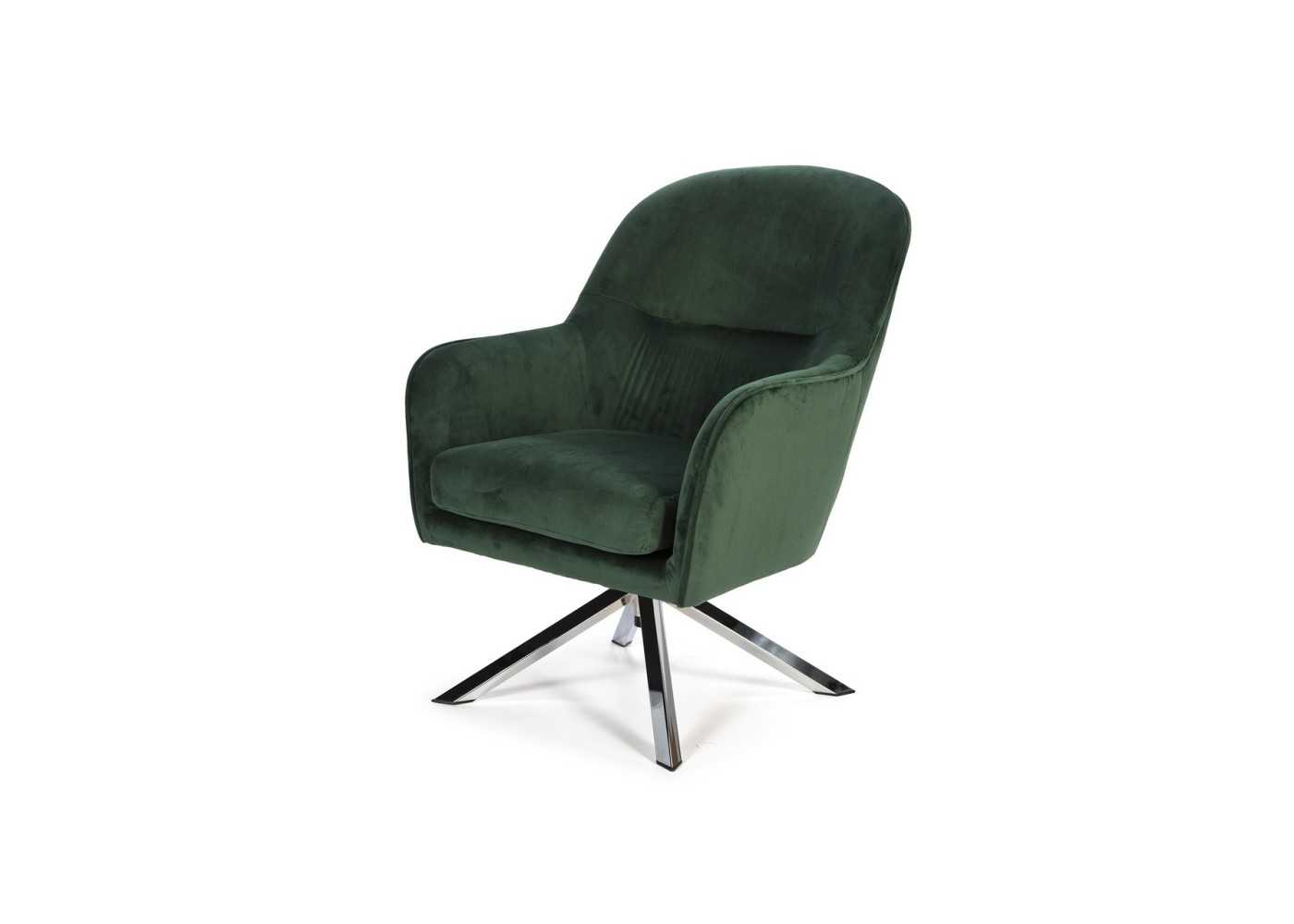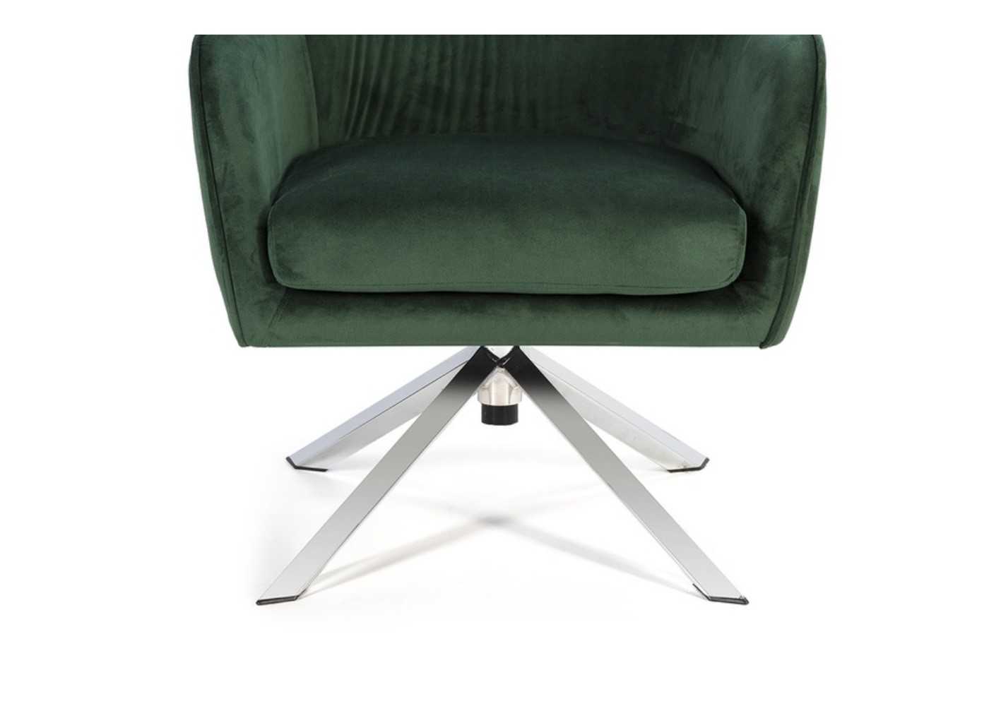 Elegant and comfortable swivel armchair upholstered in green velvet with chrome-plated steel legs.