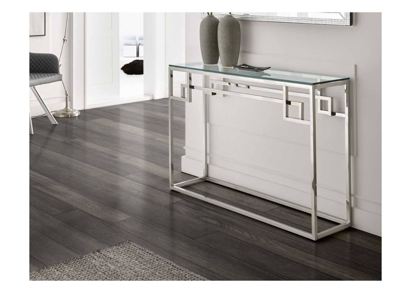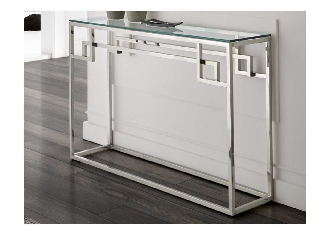 Polished stainless steel entrance console.