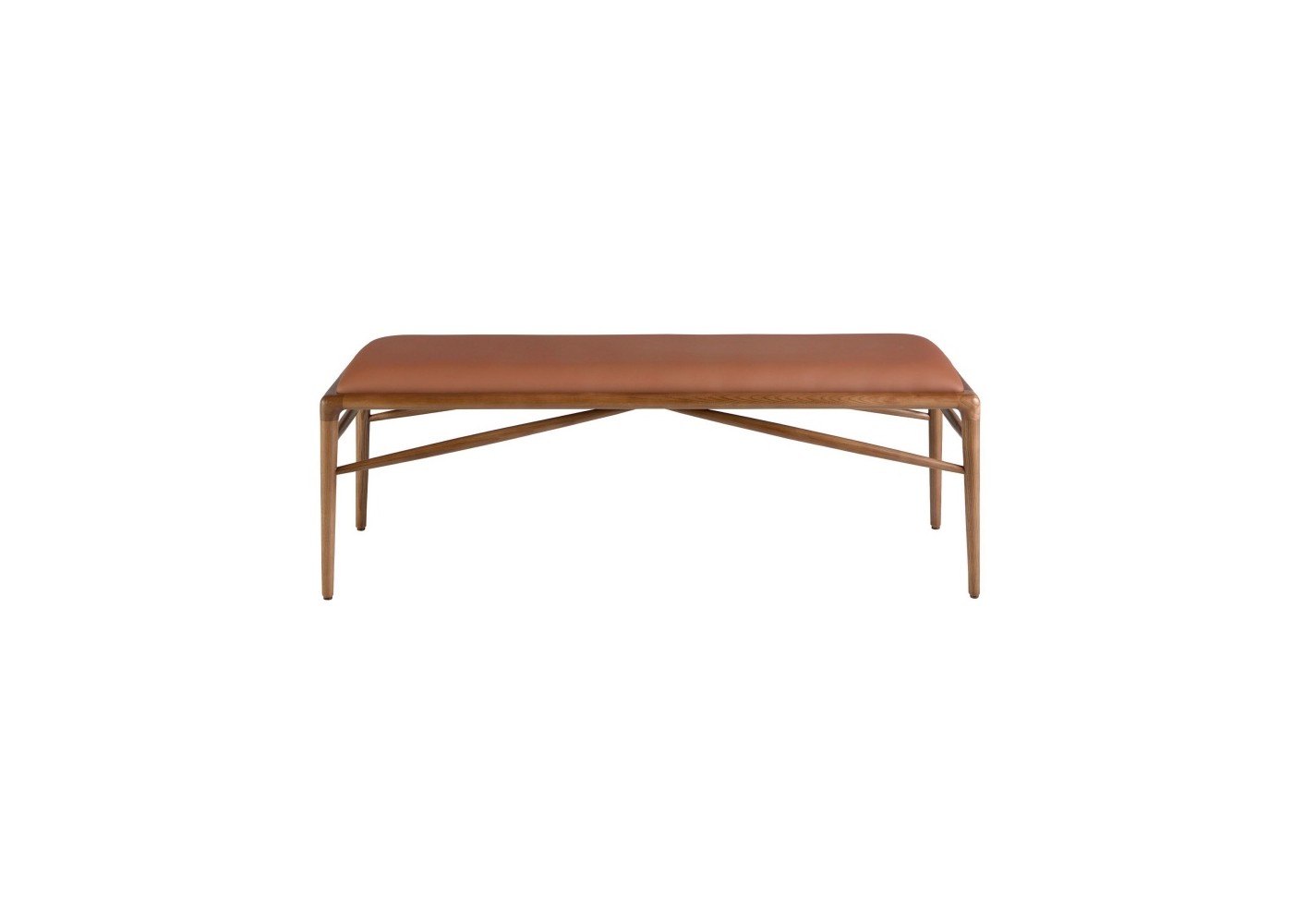 Straight design bench with solid ash wood leg structure in walnut color, upholstered in brown synthetic leather.