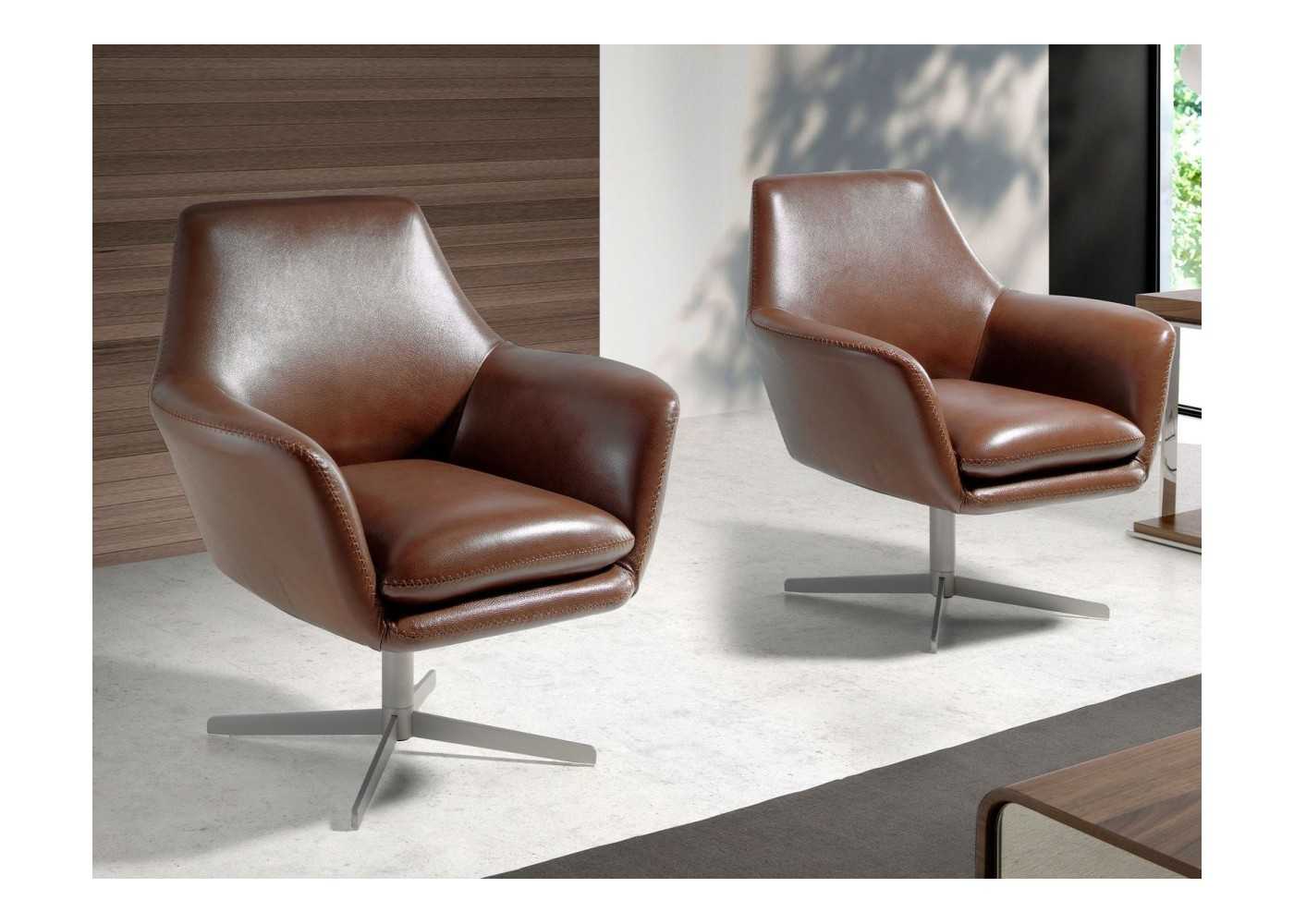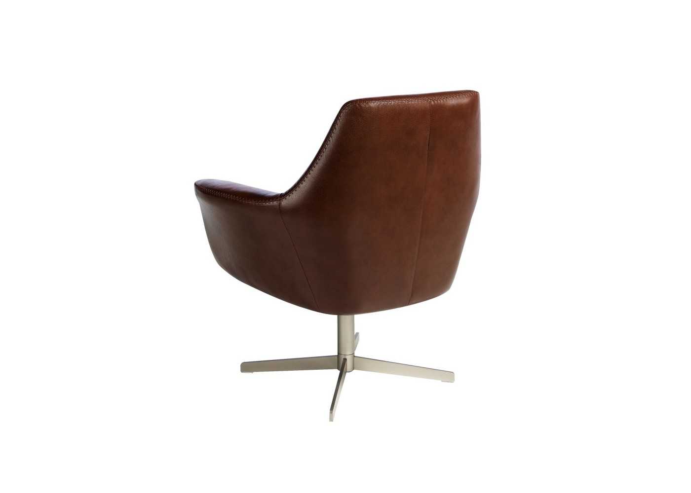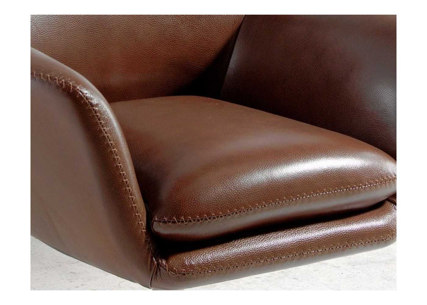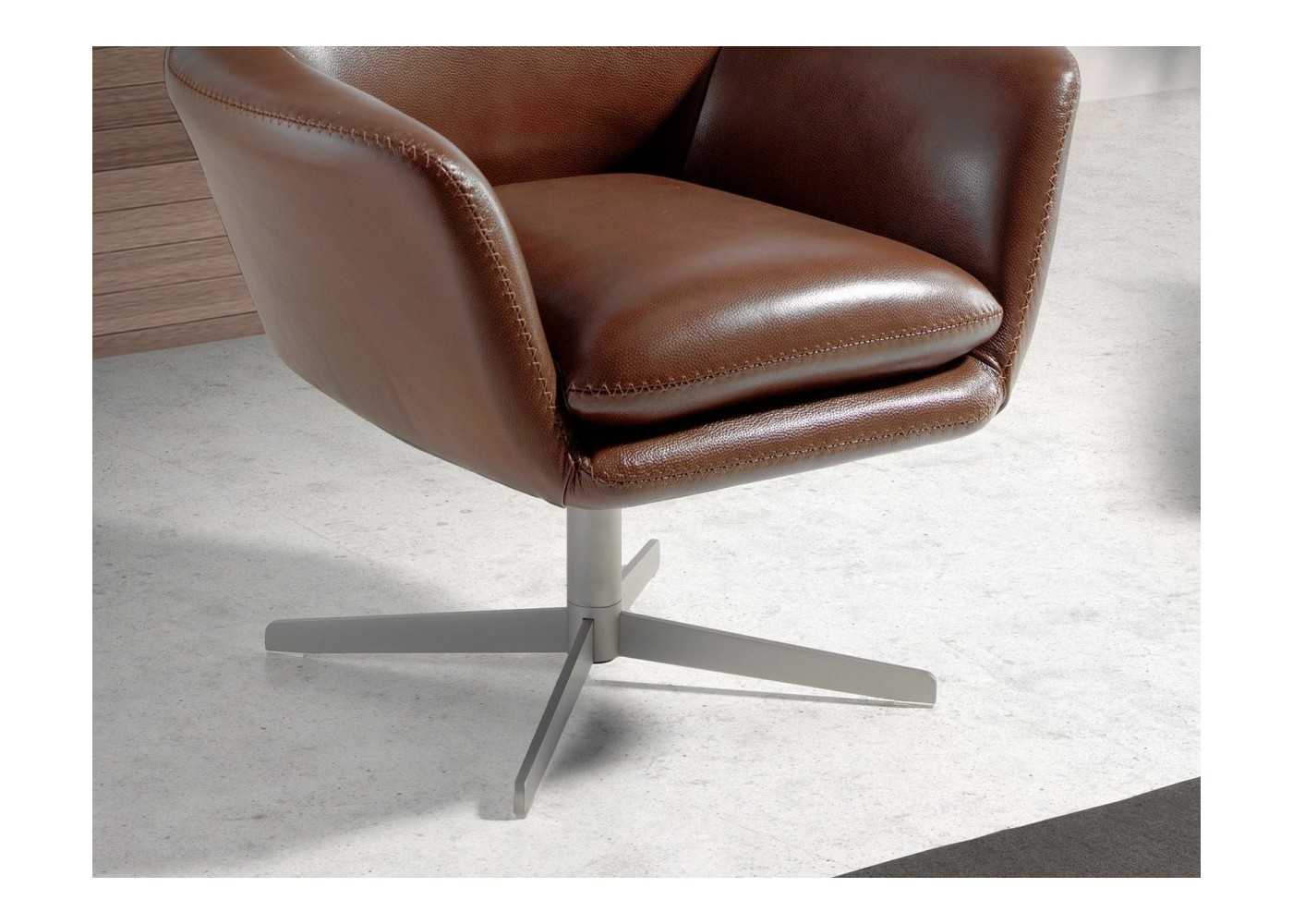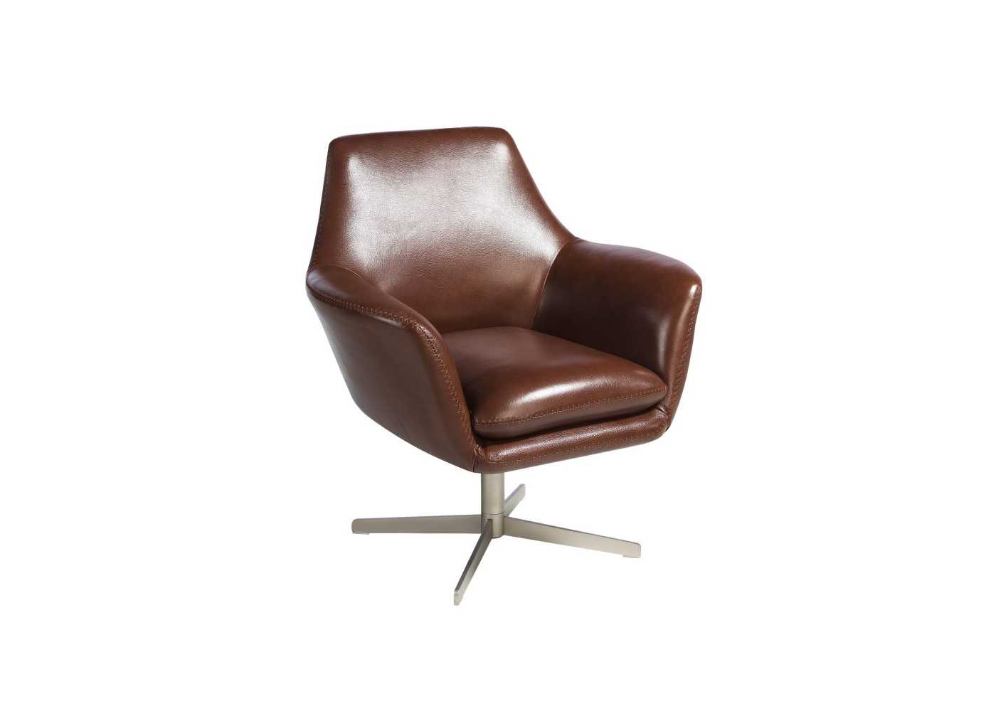 Elegant swivel armchair upholstered in genuine dark brown cowhide leather with polished stainless steel legs.