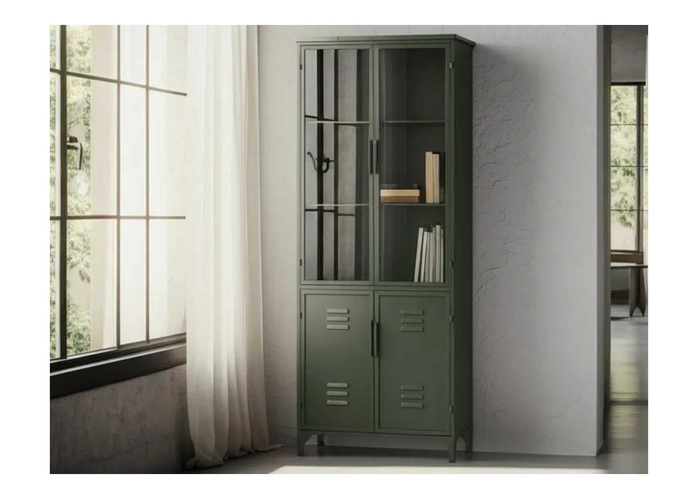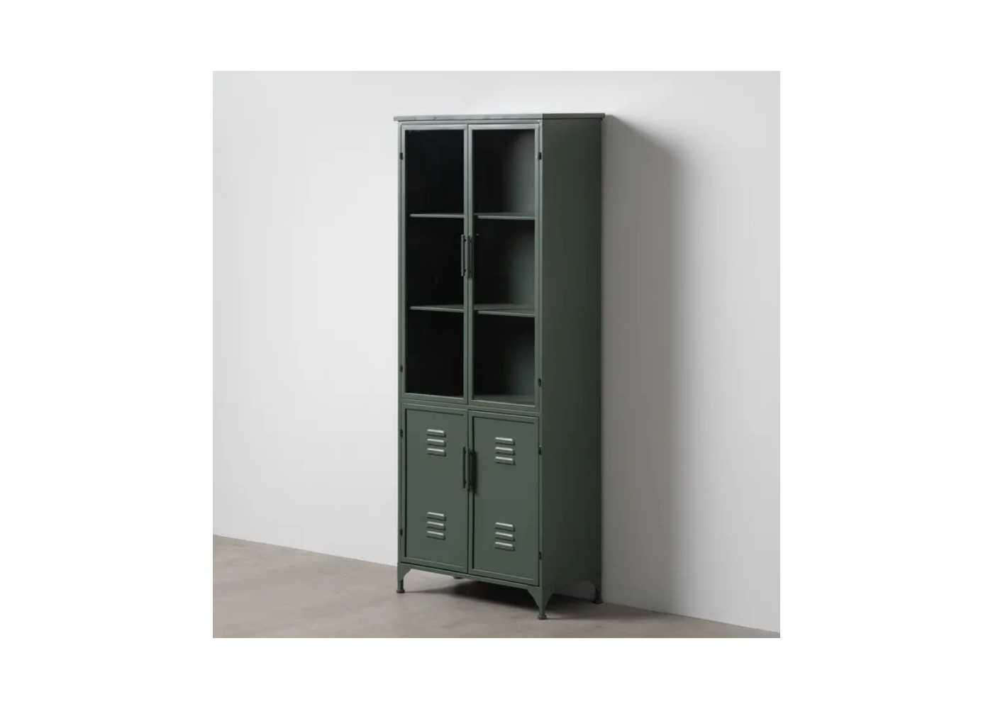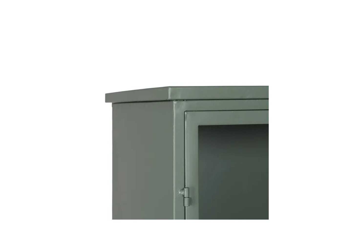 Retro and industrial design office display cabinet with doors and glass made of mint green lacquered iron.