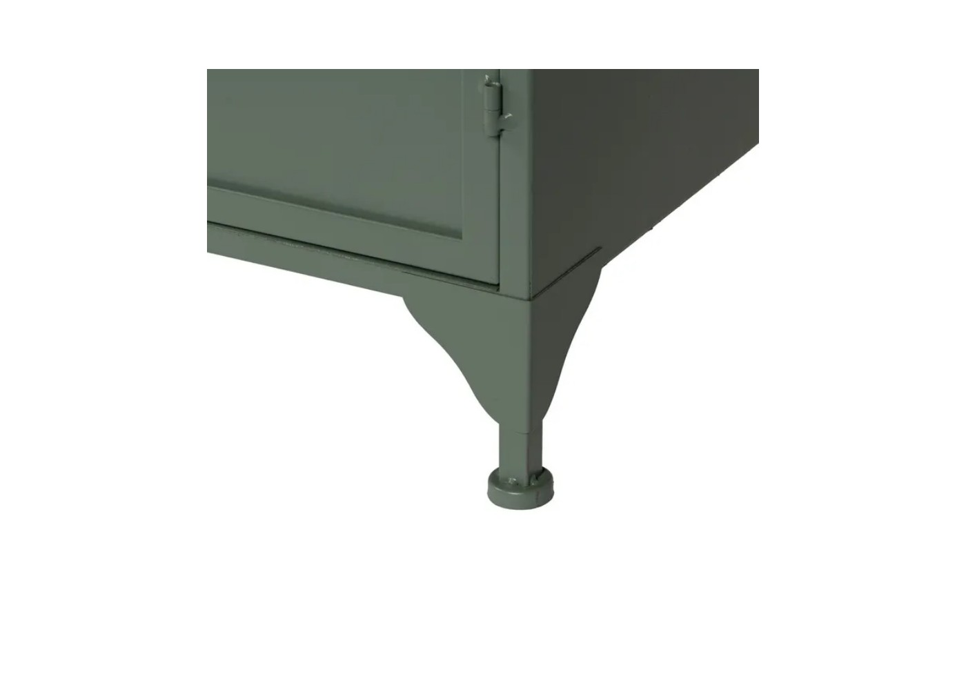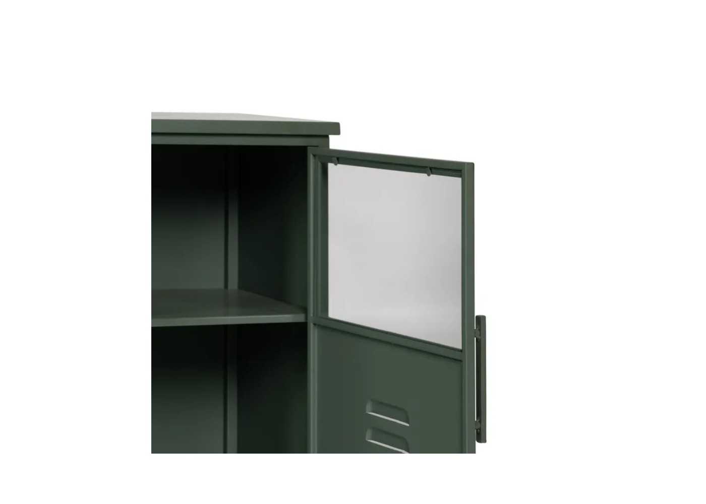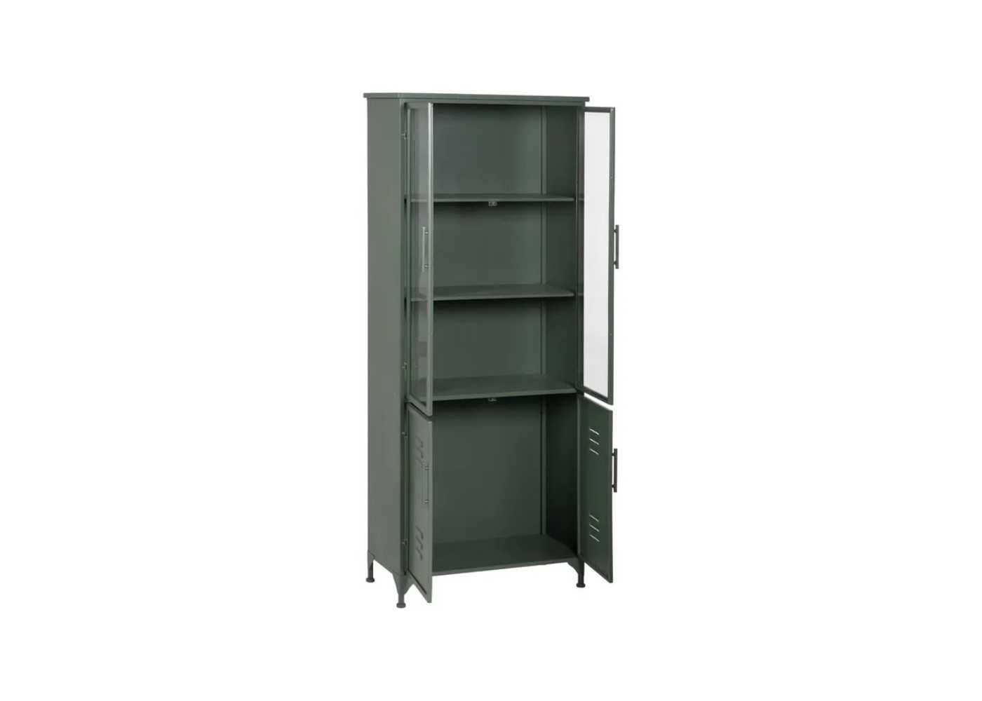 Retro and industrial design office display cabinet with doors and glass made of mint green lacquered iron.