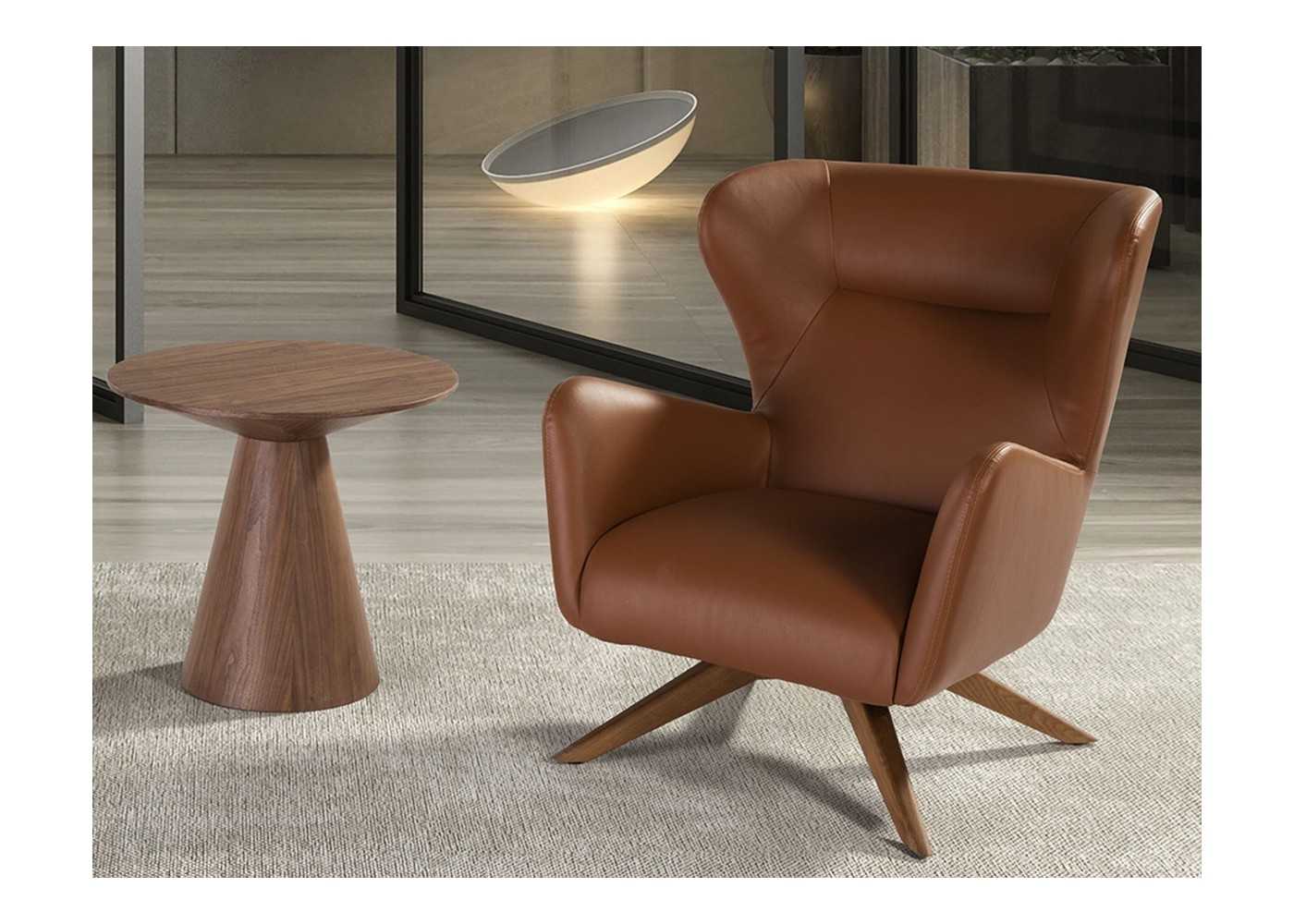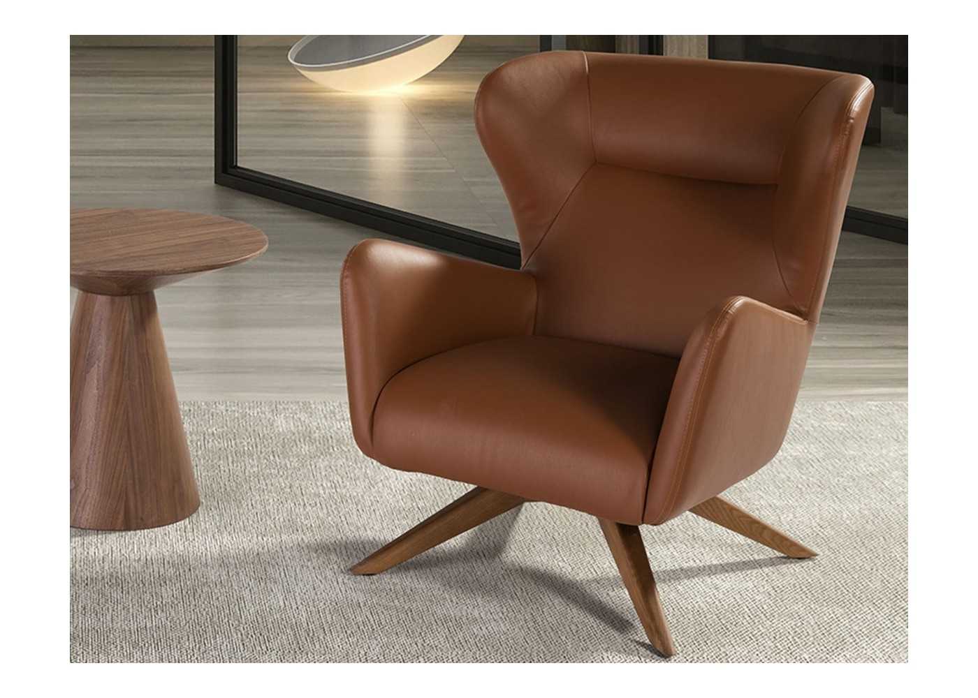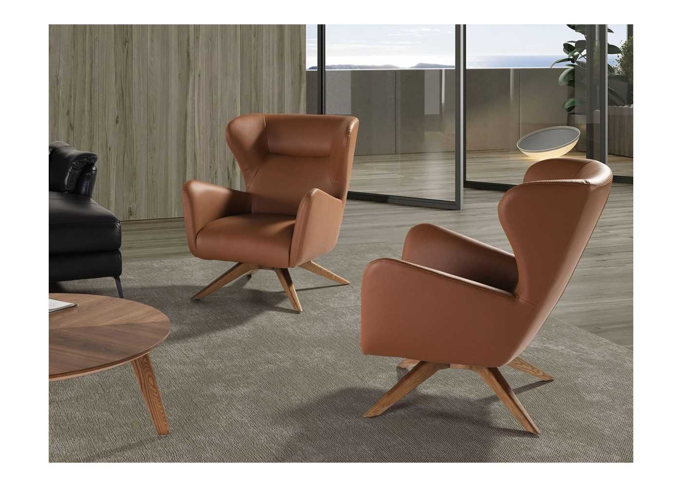 Swivel and wingback armchair with armrests upholstered in brown faux leather and solid walnut-colored ash wood leg frame.