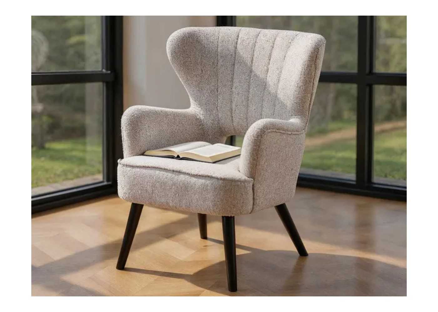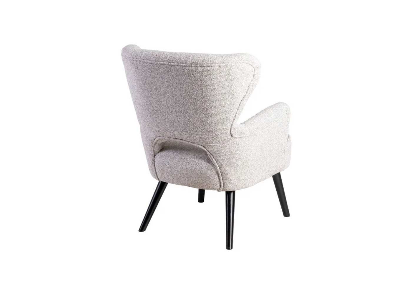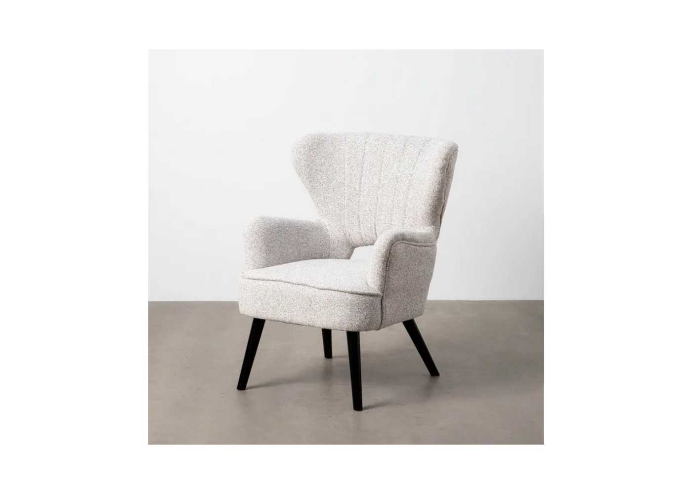 Comfortable and decorative wingback armchair with a timeless design, upholstered in ecru-tone mottled fabric with solid pine wood legs lacquered in black.