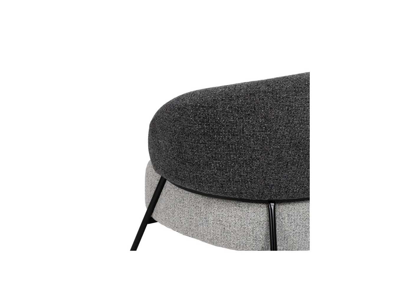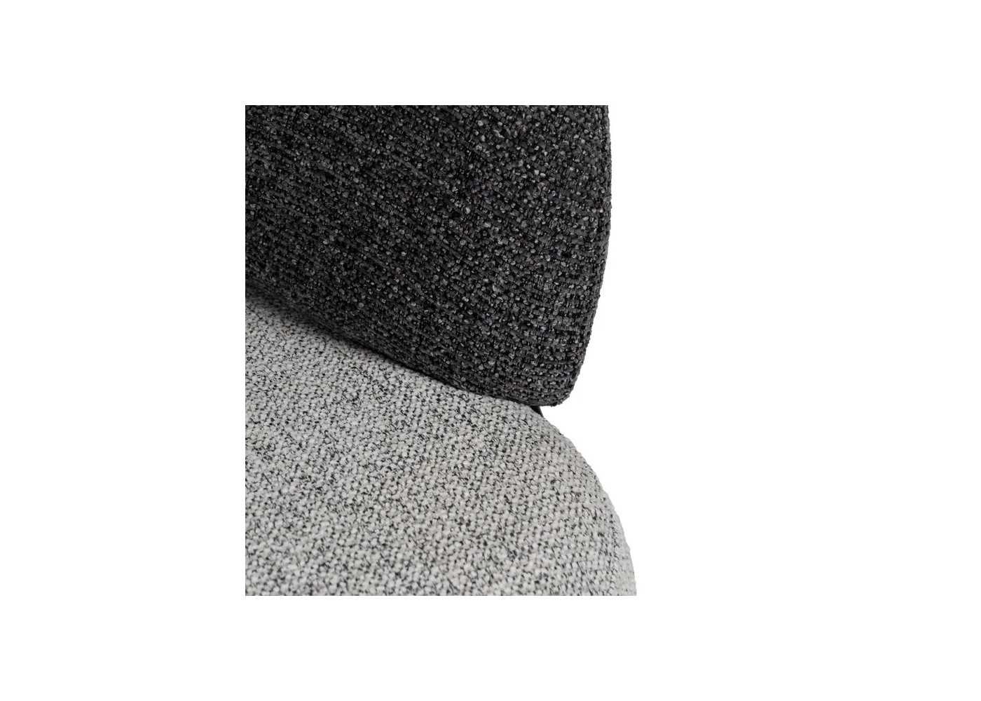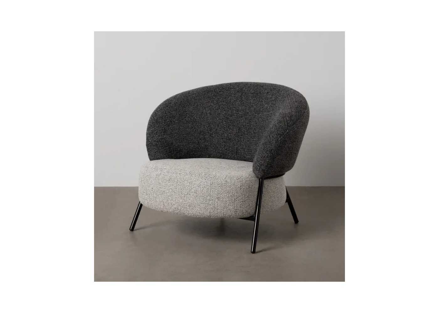Comfortable and elegant monobloc armchair upholstered in two-tone dark gray and light gray marbled fabrics with black lacquered steel base structure.