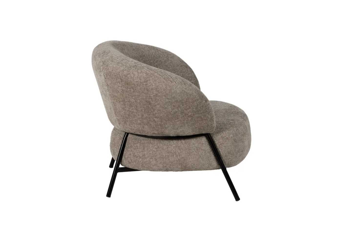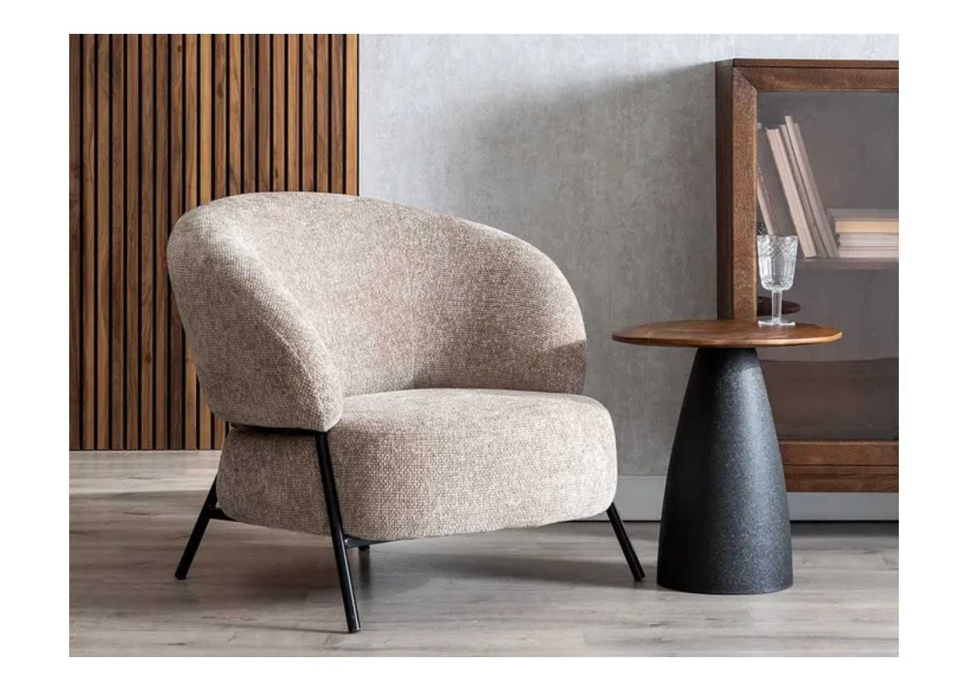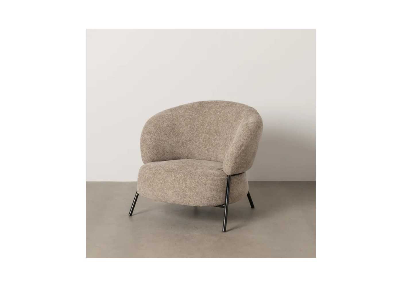 A comfortable and elegant one-piece armchair upholstered in beige marbled fabric (100% polyester) with a black lacquered steel frame.