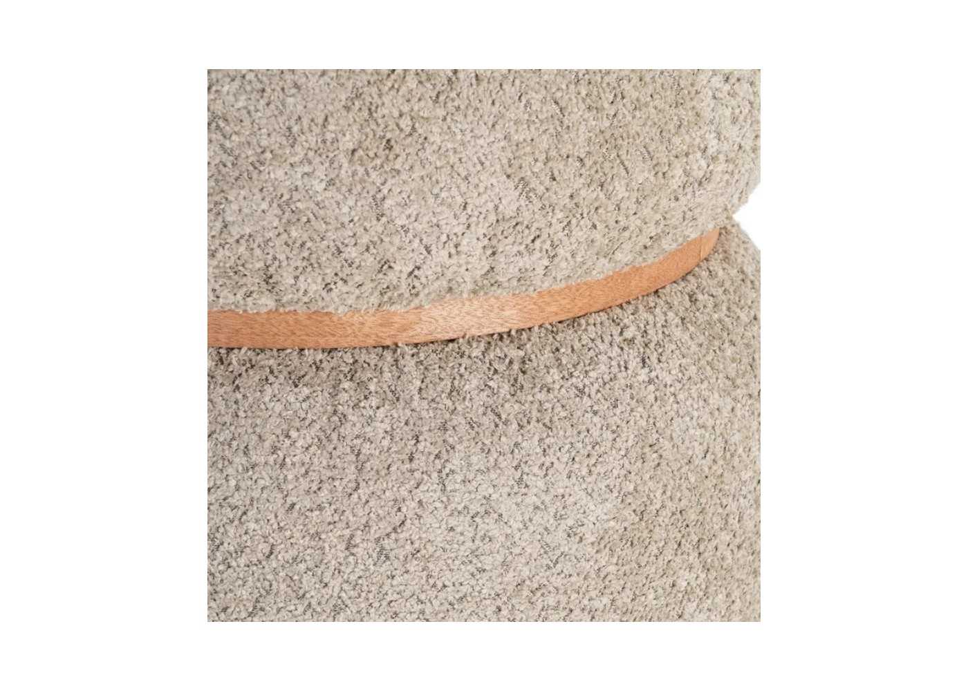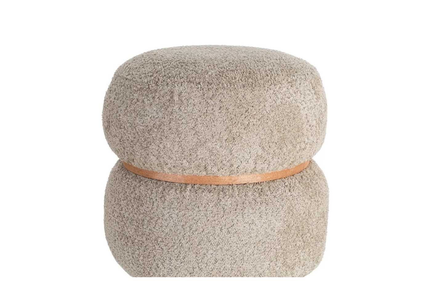 Modern, round pouff made of pine wood with 100% polyester crinkle fabric upholstery in taupe.