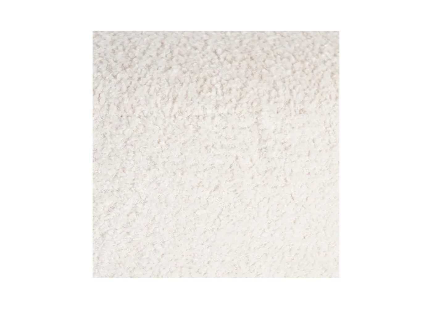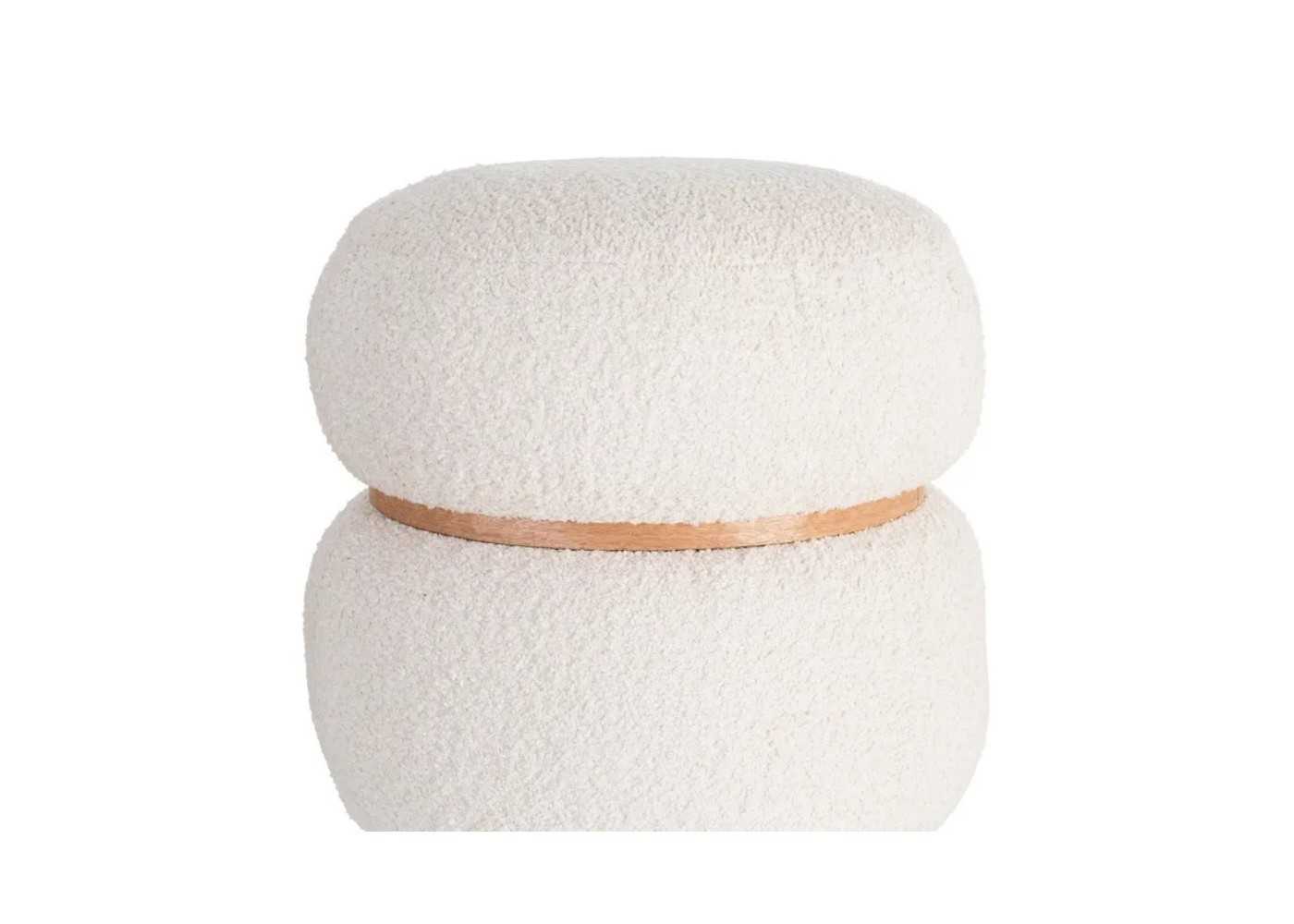 Modern, round pouff made of pine wood with 100% polyester crinkle fabric upholstery in cream colour.