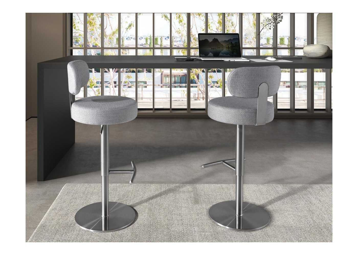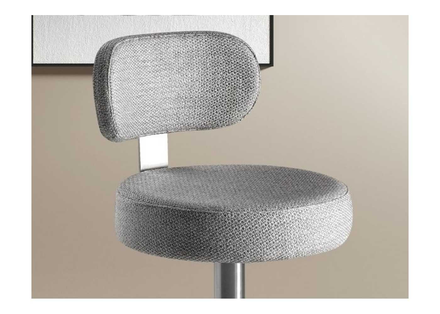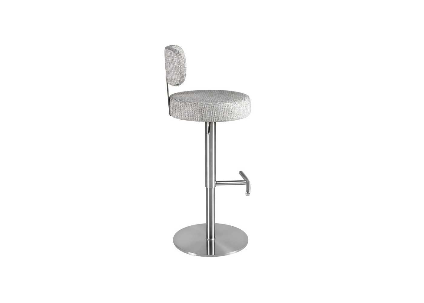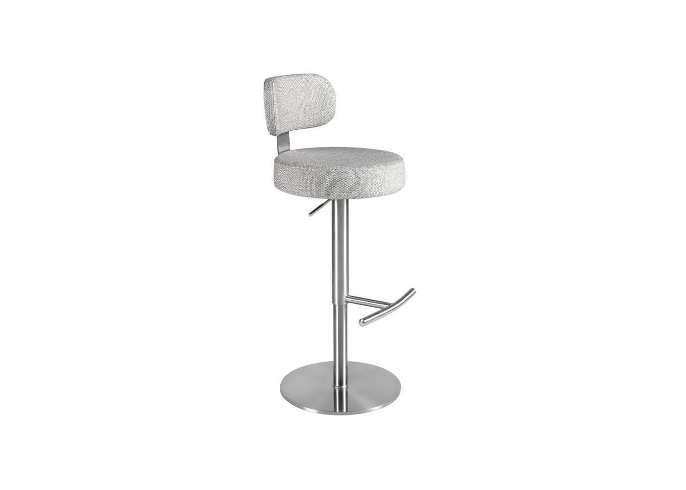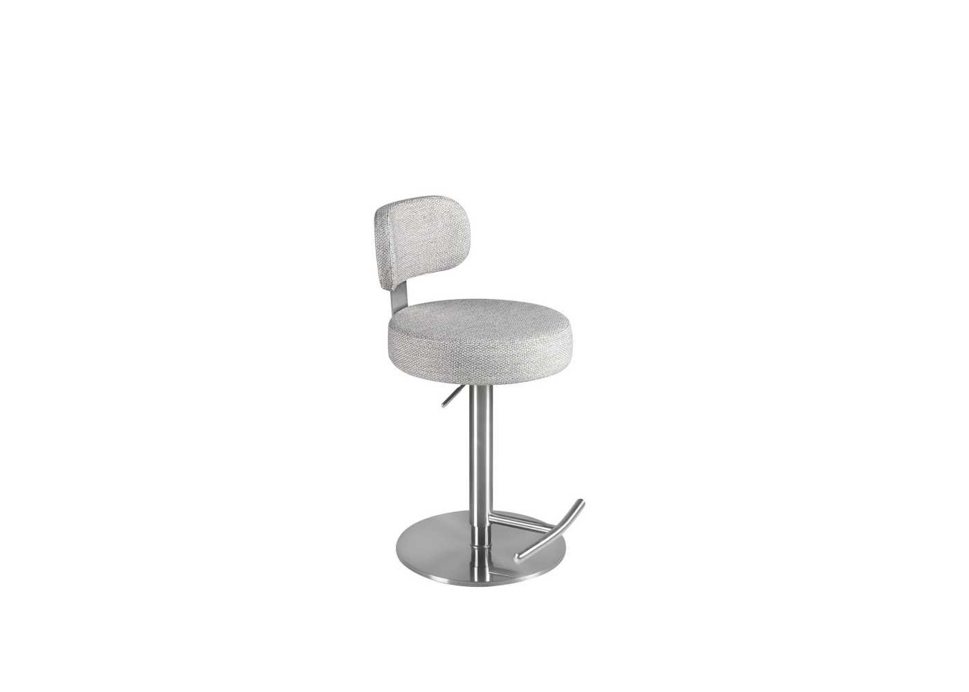 Elegant, modern swivel stool with height-adjustable seat. Upholstered in fabric. Stainless steel base and backrest frame.