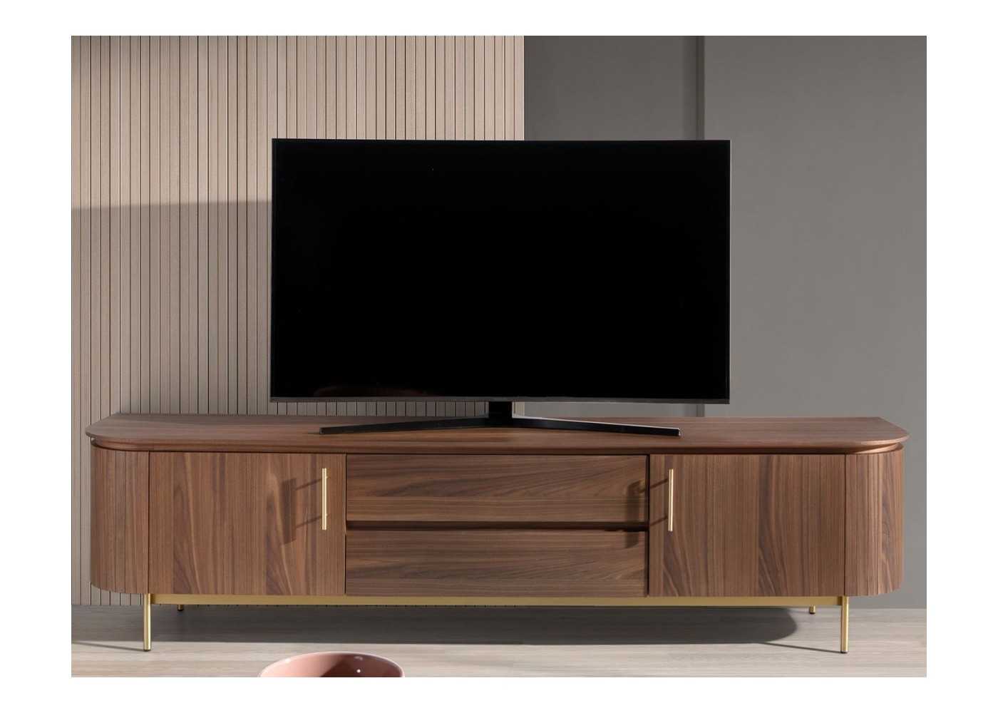 Elegant, versatile and functional TV cabinet with rounded lines and a structure made of 0.5 mm thick walnut-veneered ash wood.