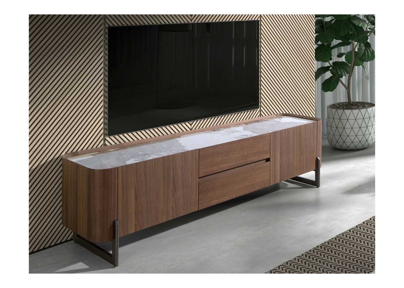 TV cabinet in natural walnut veneer with legs in metallic mink stainless steel and a glossy porcelain marble top with white, brown and grey tones.
