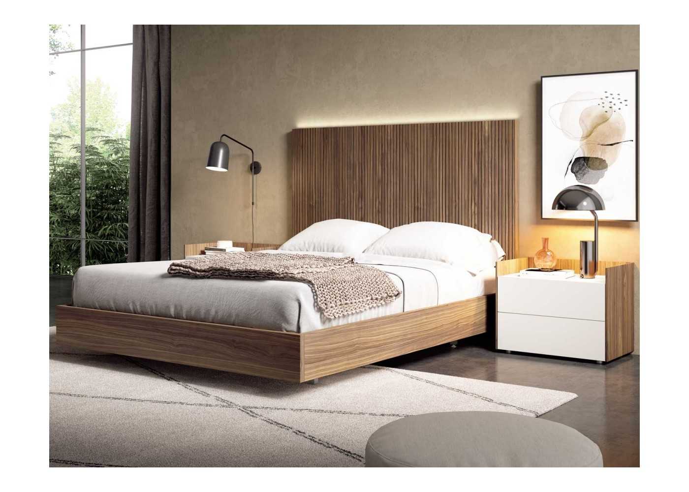 Cama completa lacada con frontal central en roble alistonado, mesitas de 1 cajón y base...