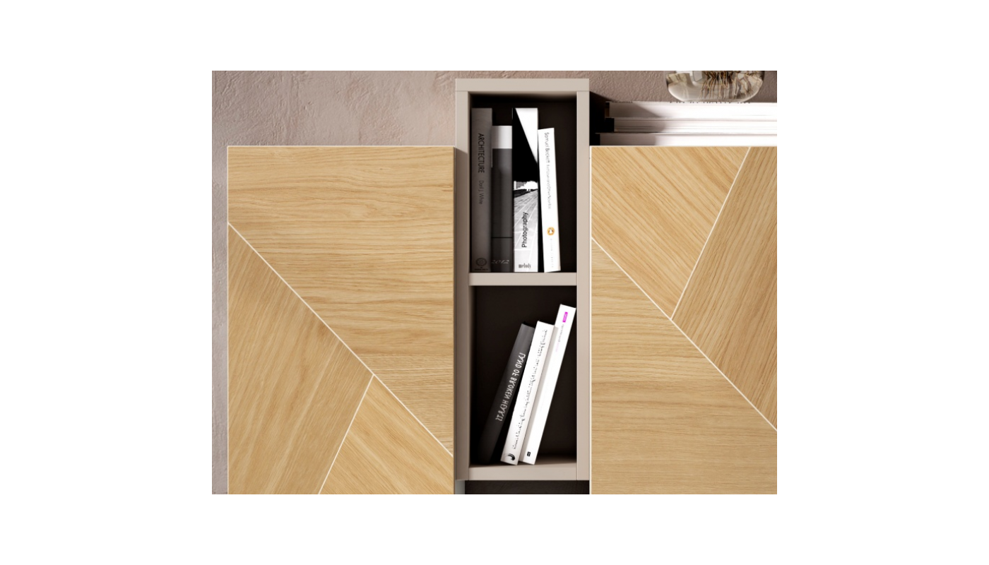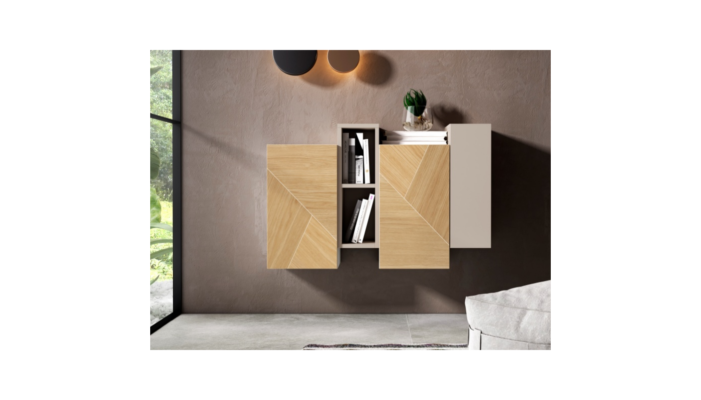 Consola colgada a pared lacada en color visón con frentes de puertas batientes chapados en marquetería de roble.