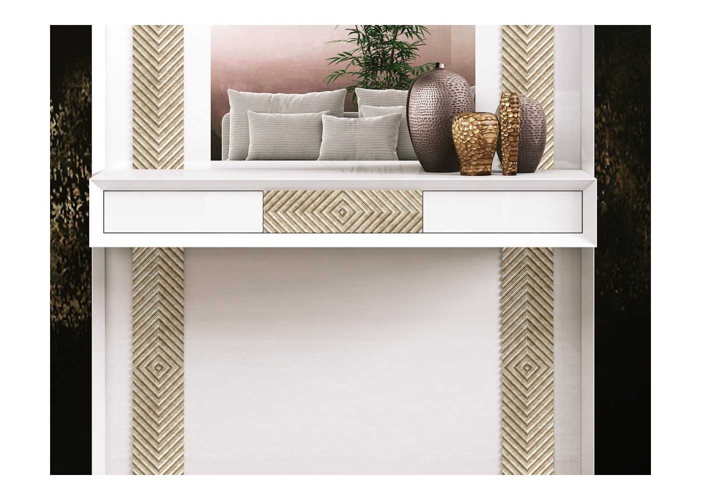 Trasera lacada con moldura ingletada de 9 cm y detalles laterales de grabados en rombos color marmolizado champagne con posibilidad de marmolizado plata sin incremento de precio.