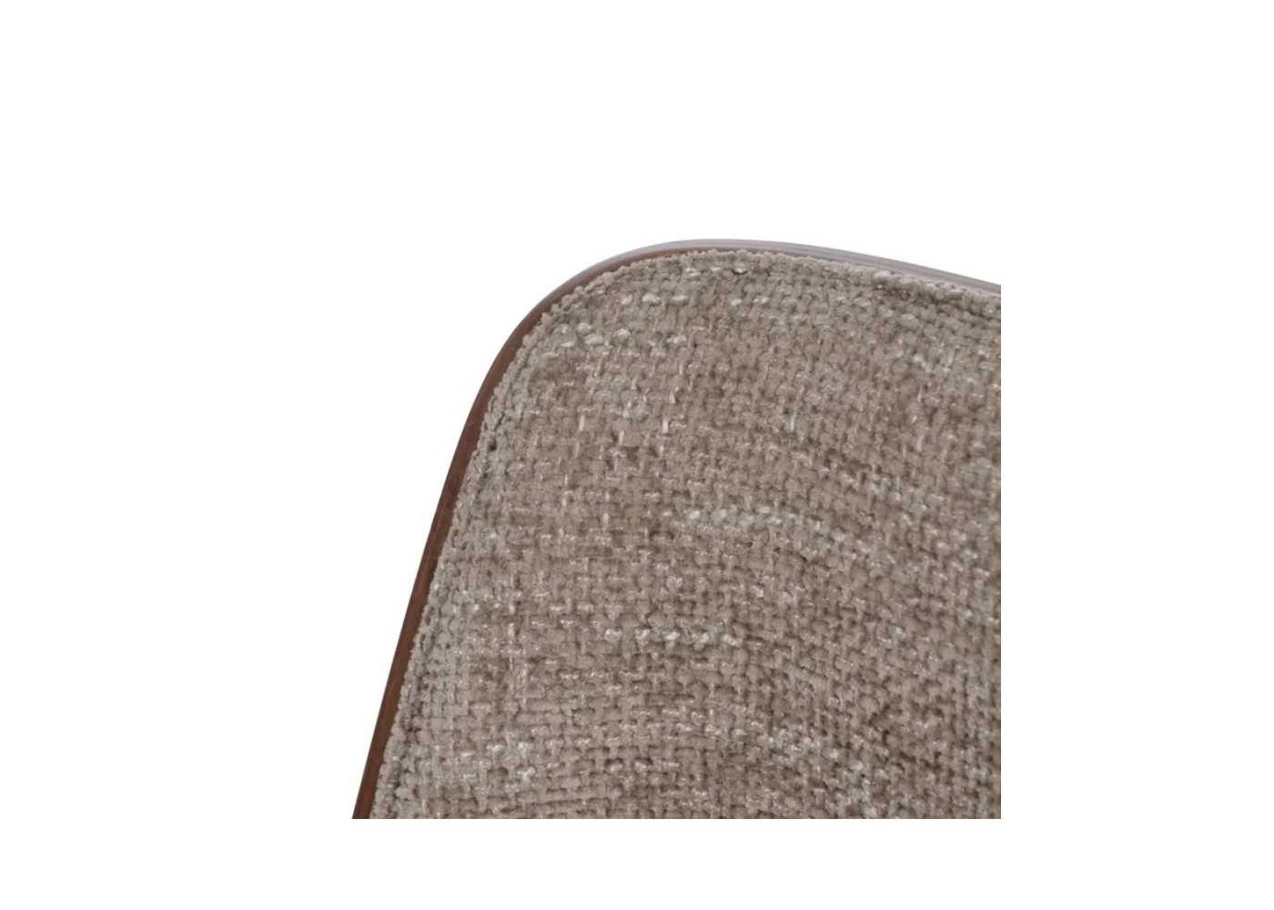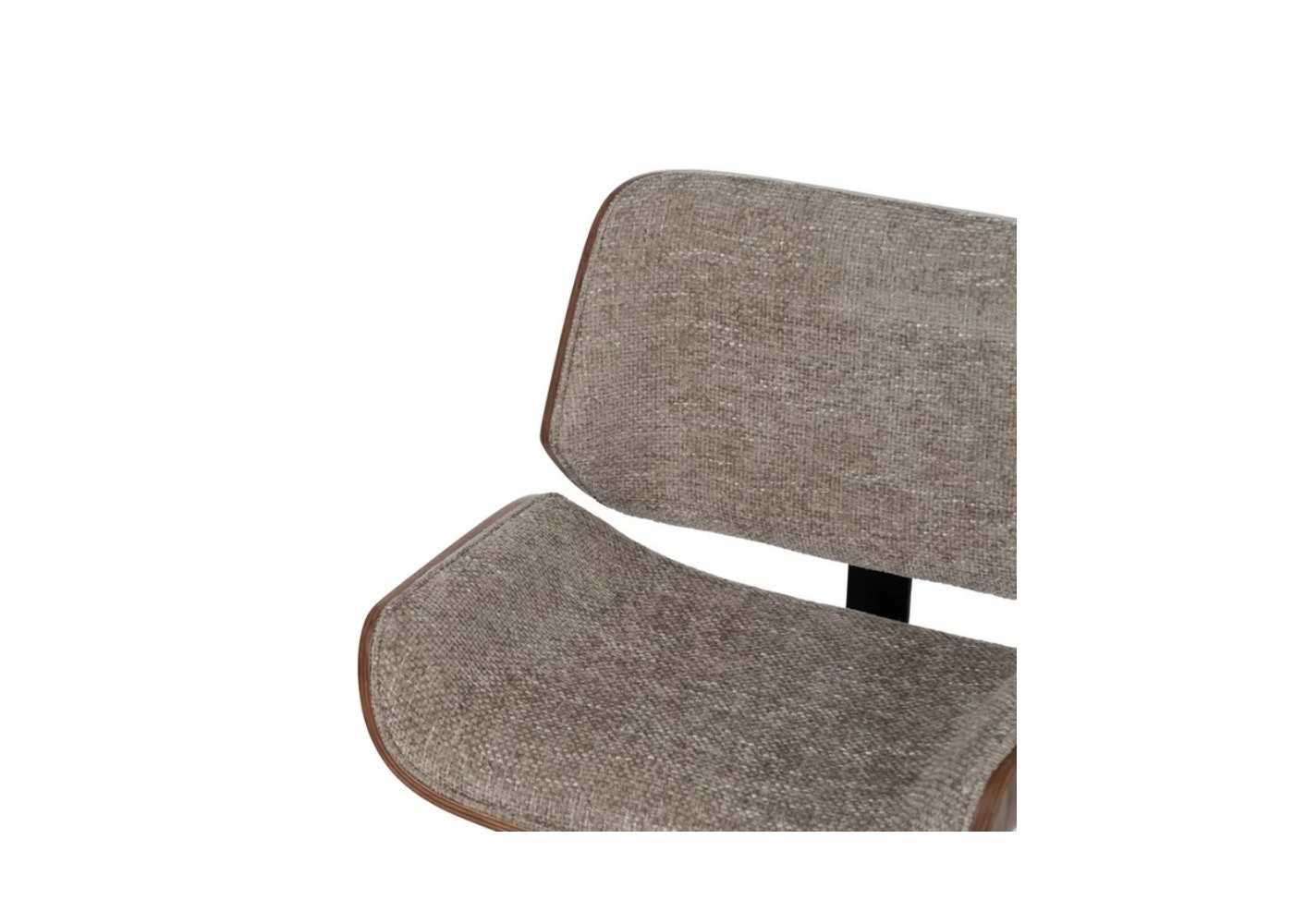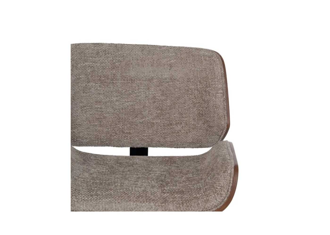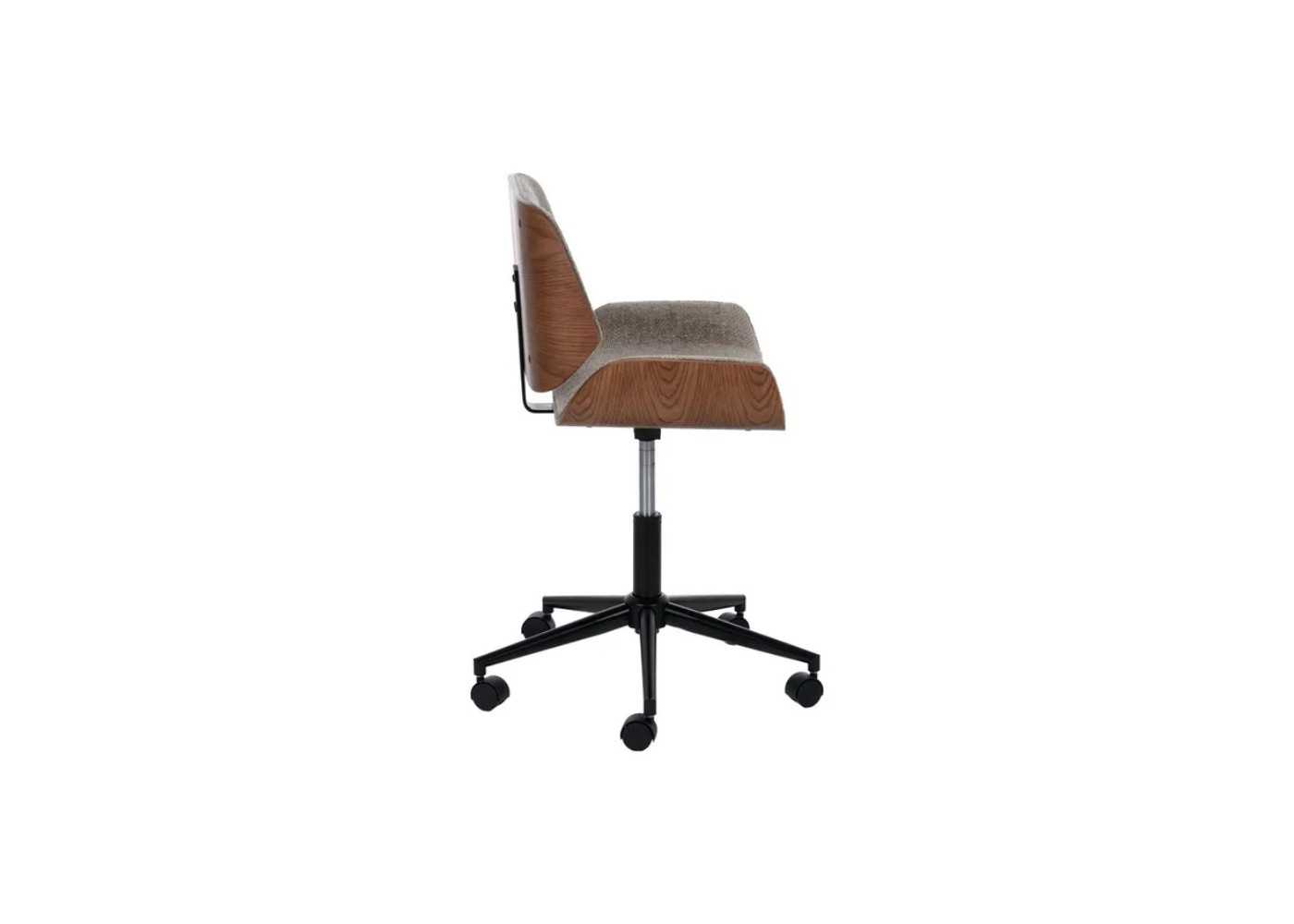 Silla de oficina giratoria con estructura de conglomerado de nogal e interior tapizada en tela rizada en color beige con mecanismo de altura regulable.