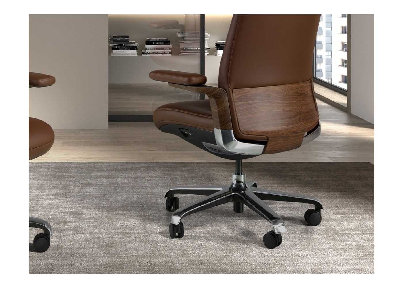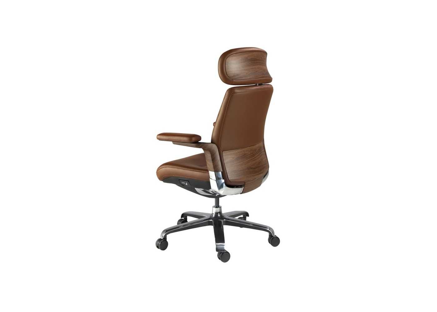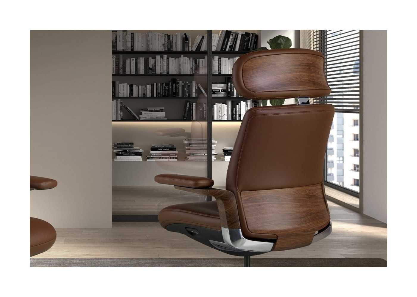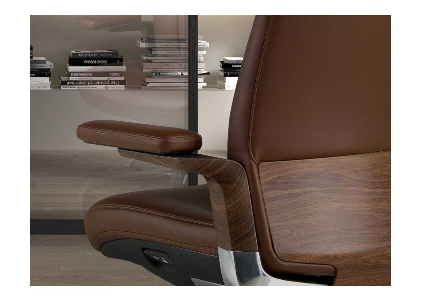 Sillón de oficina giratorio de diseño moderno y ergonómico tapizado en piel sintética color marrón con brazos , detalles de madera chapada de nogal y base giratoria de acero inoxidable pulido con ruedas.
