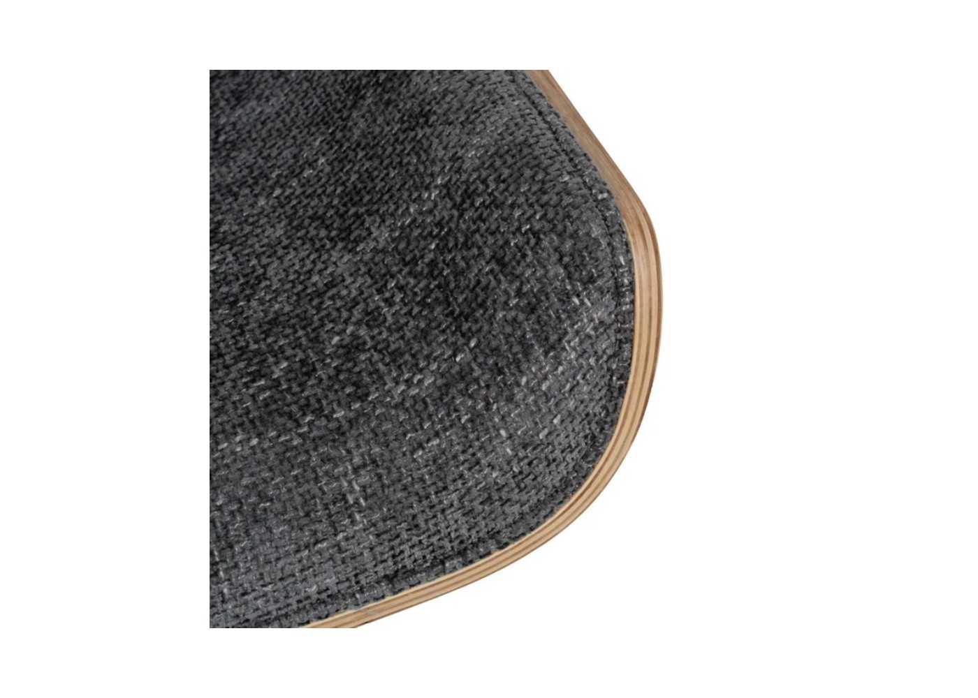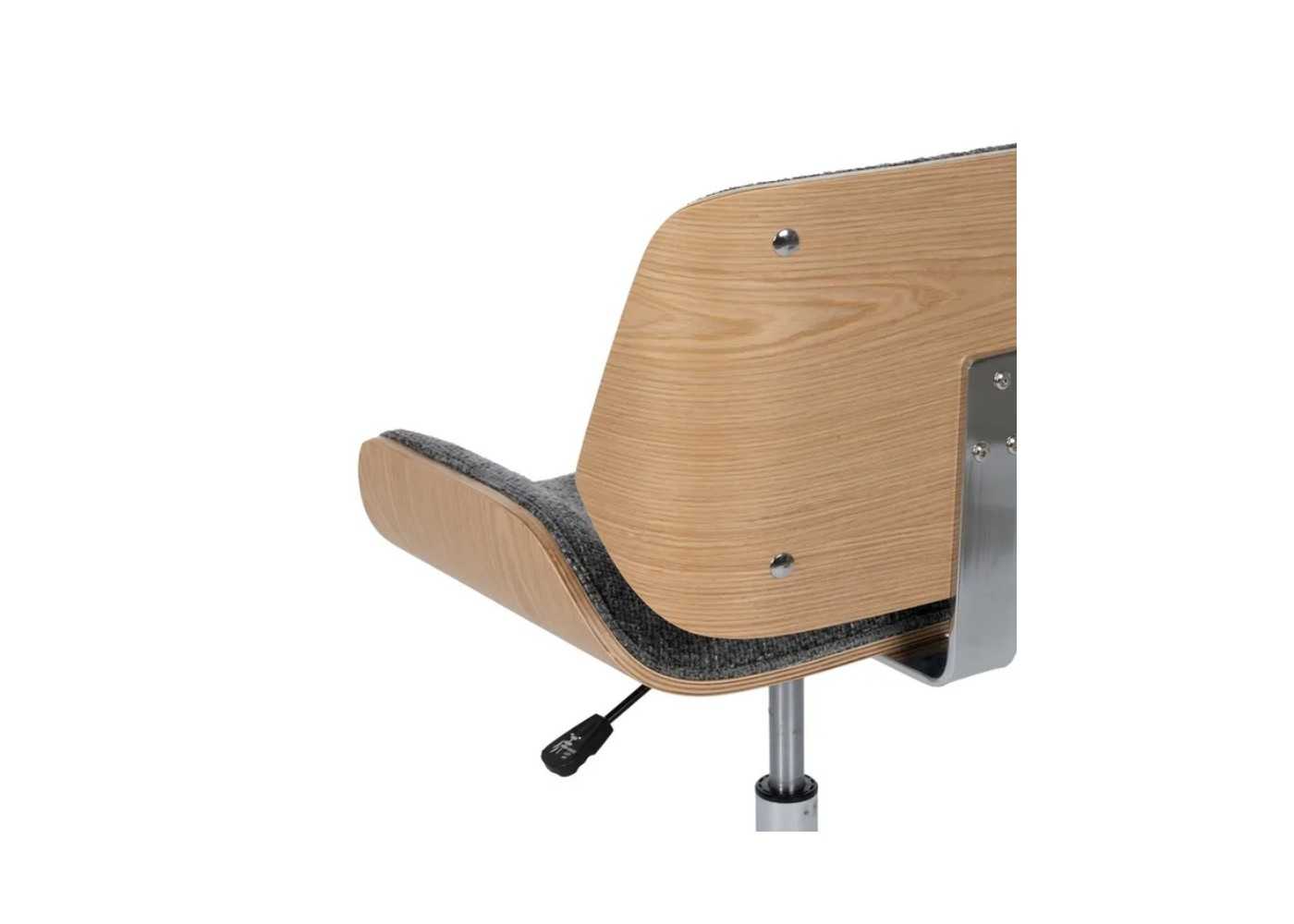 Silla de oficina giratoria con estructura de conglomerado de nogal claro e interior tapizada en tela rizada en color gris oscuro con mecanismo de altura regulable.