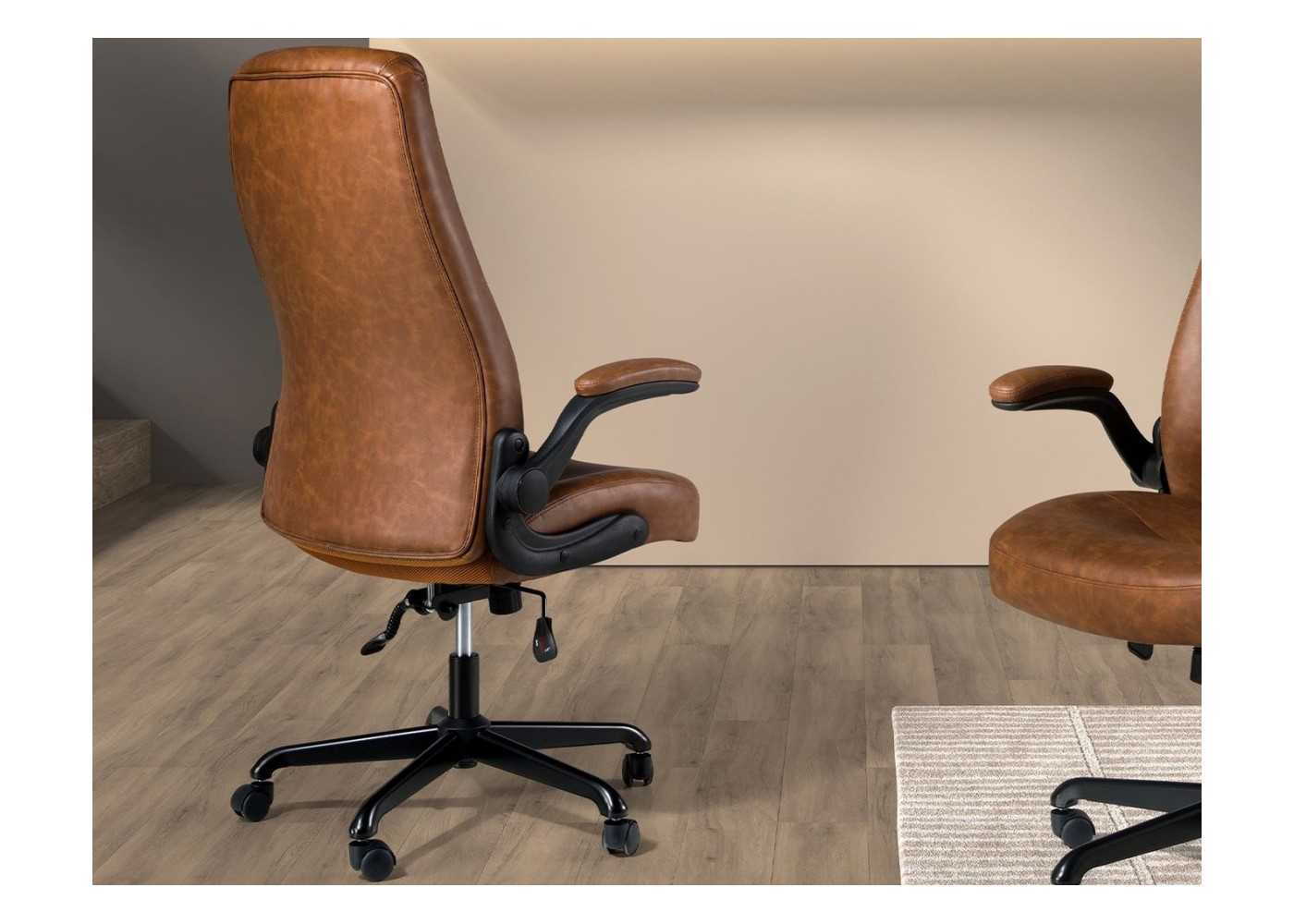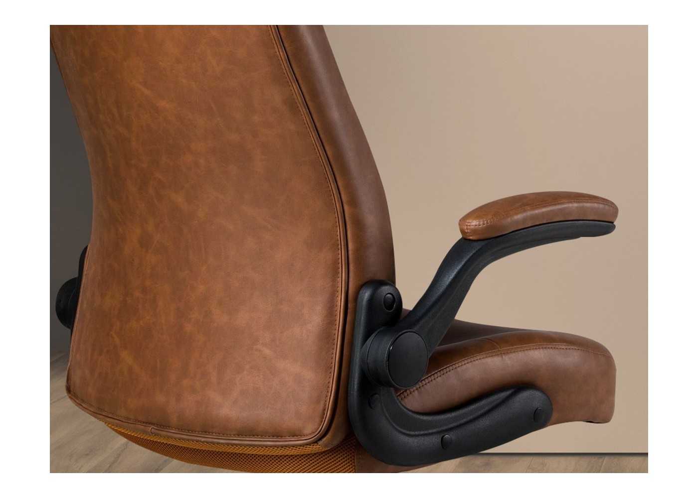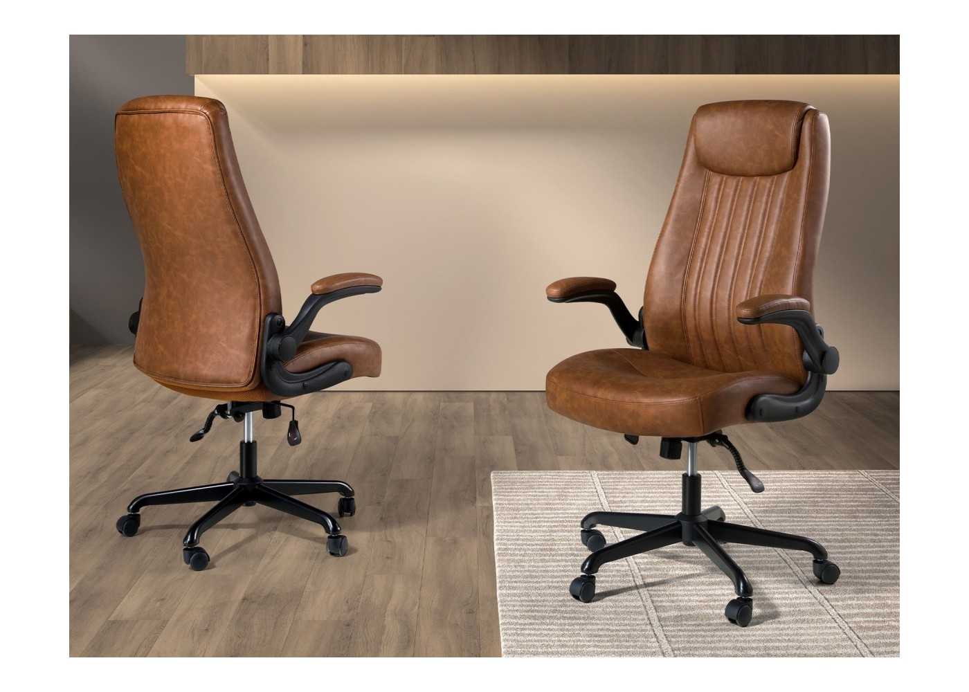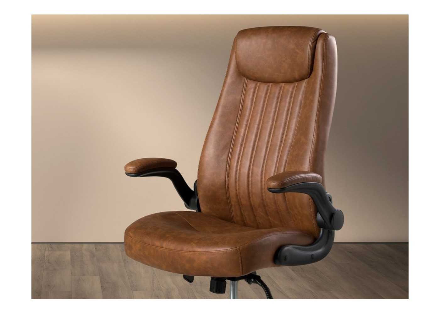 Sillón de oficina giratorio de diseño moderno y ergonómico tapizado en piel sintética color marrón con brazos y base giratoria de acero inoxidable negro.