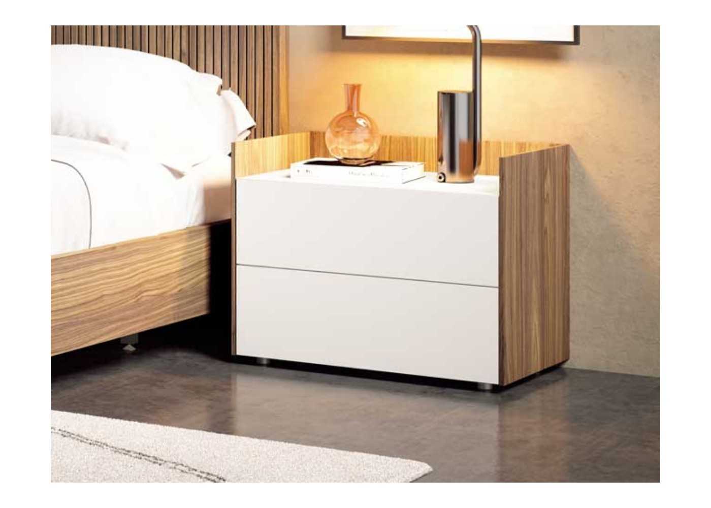 Original mesita de noche con 2 cajones. Estructura de madera chapada en nogal americano y frente de cajones lacados en color blanco mate.