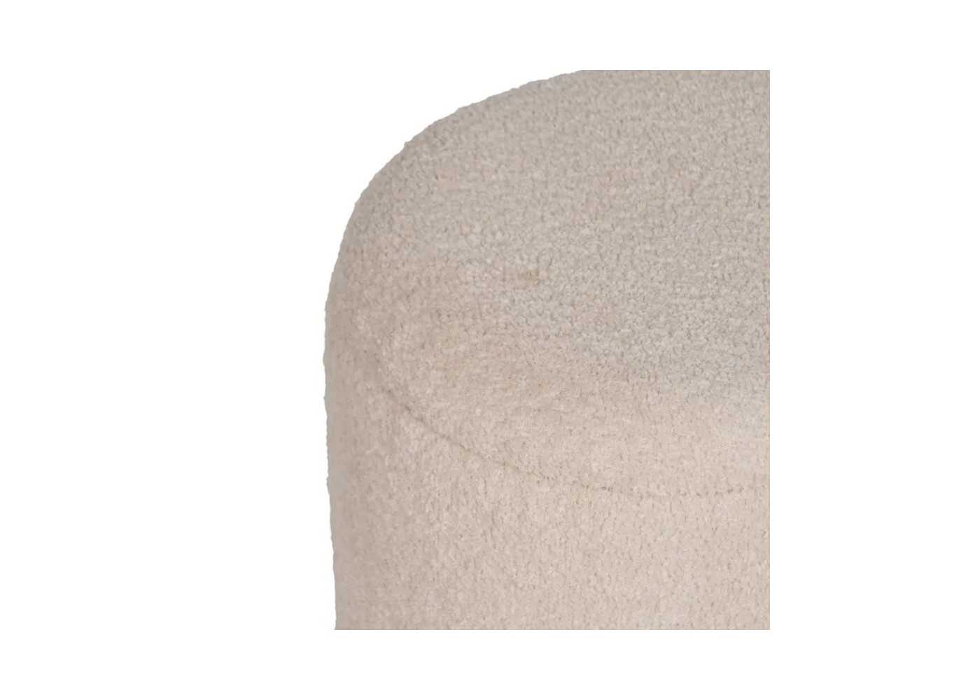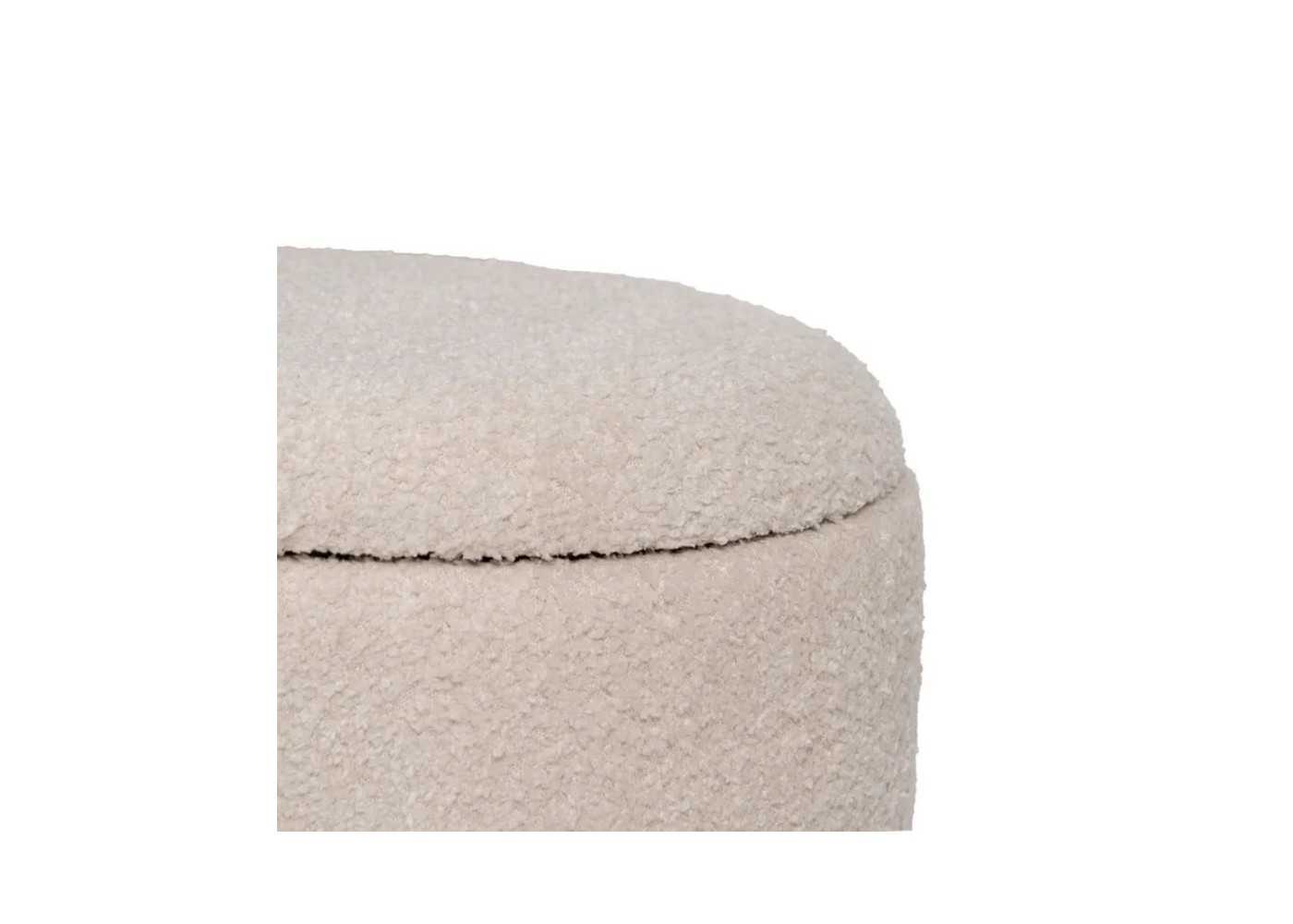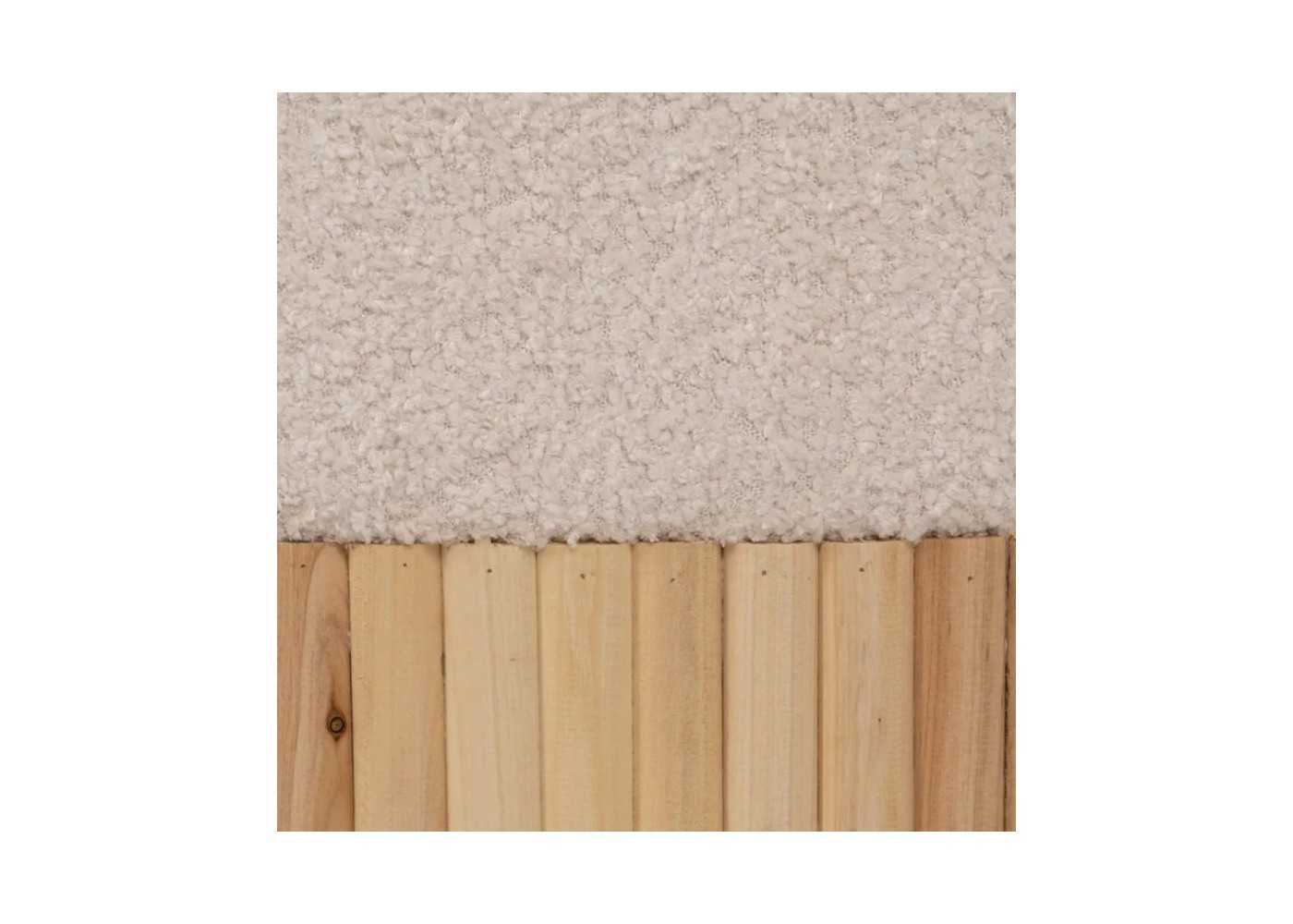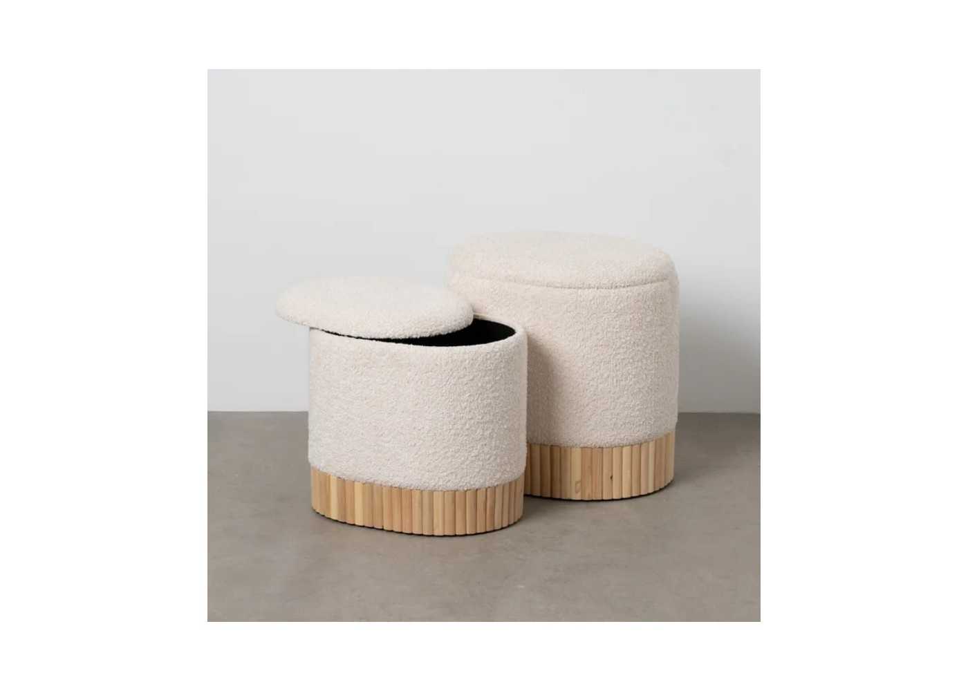 Elegante conjunto formado por 2 pufs ovalados y huecos para almacenaje de diferentes medidas.Tapizados en tela rizada color crema con detalles en la base de madera alistonada.