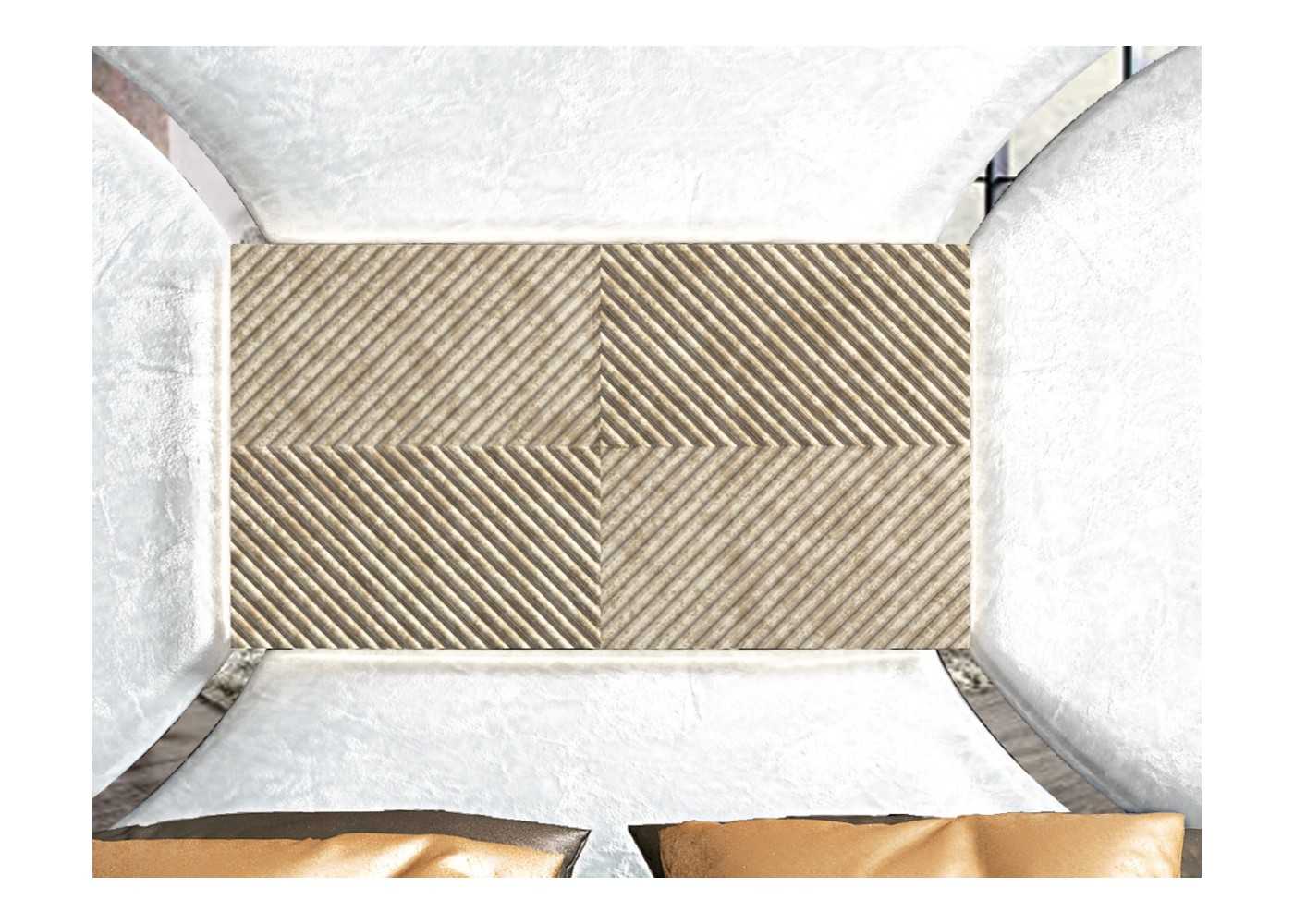 4 plafones tapizados en terciopelo LUXE color blanco con originales detalles de planchas de metacrilato efecto espejo de 5 mm de grosor 25 mm de ancho. Plafón central con un original diseño de rombos en color marmolizado champagne. Posibilidad de marmolizado plata sin incremento de precio.