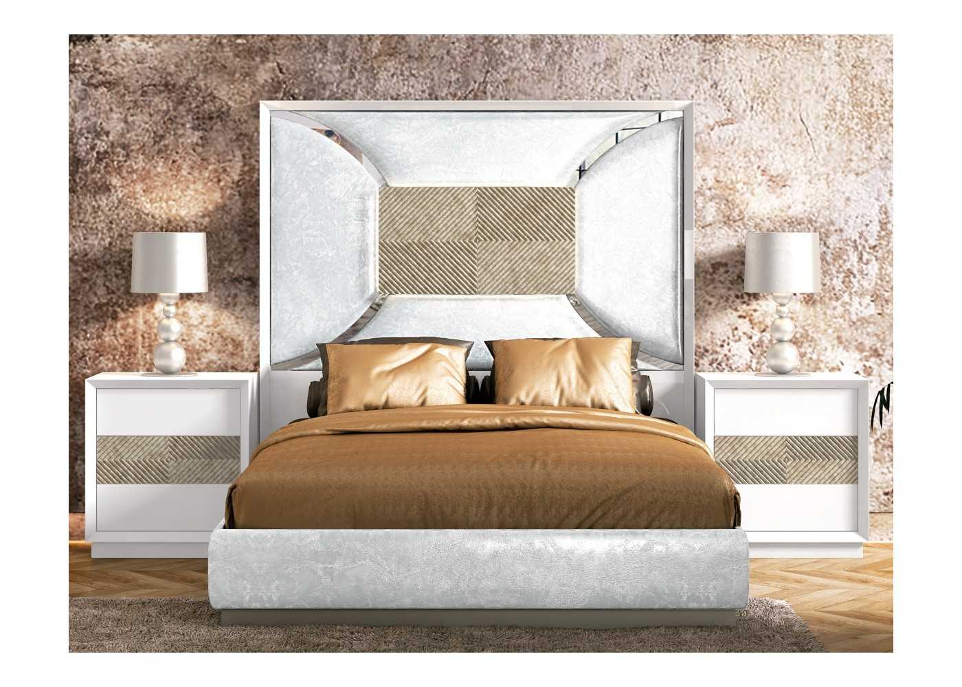 Original y elegante cabecero alto lacado mate en color blanco puro, tapizado en terciopelo LUXE con detalles de metacrilato efecto espejo y plafón central de rombos en acabado marmolizado champagne.