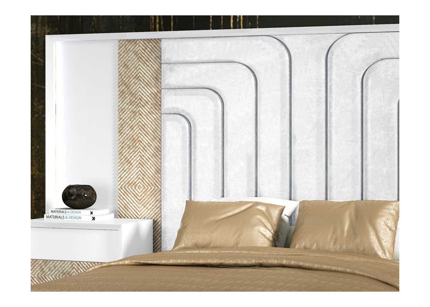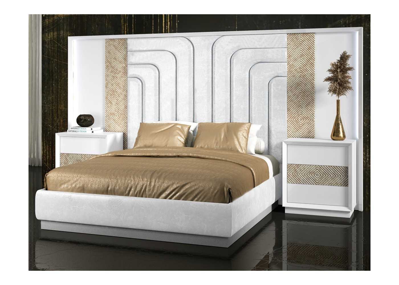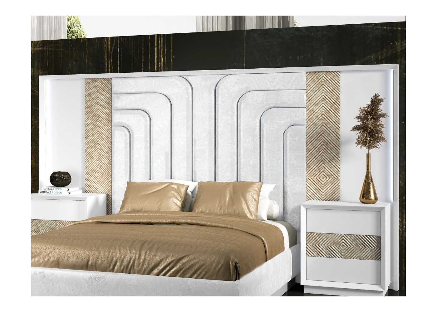 Cama completa con cabecero XXL tapizado y lacado de diseño moderno - ANIK
