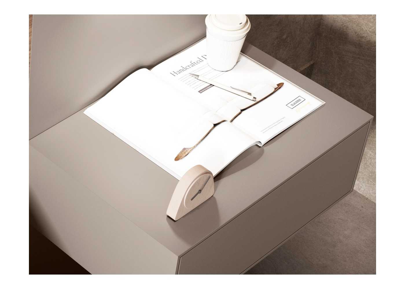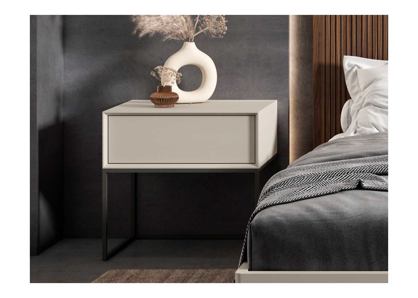 Mesita de noche de 1 cajón lacada con cantos ingletados y base de acero inoxidable lacado color grafito.