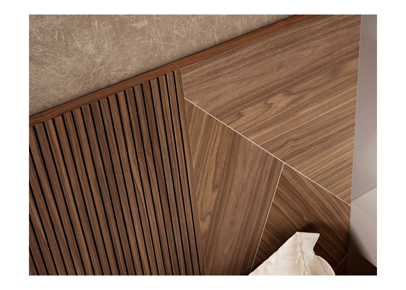 Elegante cabecero XXL con plafón central en madera alistonada de roble americano con laterales de marquetería de roble americano. Plafones laterales lacados con mesitas voladas de 1 cajón y apliques de luz led incorporados.