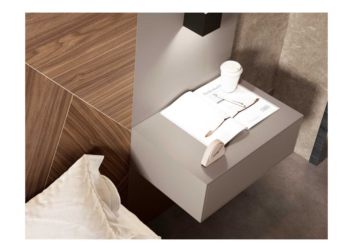 2 paneles laterales exteriores de FIBRALAC lacados en color visón mate con mesitas de 1 cajón voladas y 2 apliques de acero color negro epoxi con luz led e interruptor oculto.