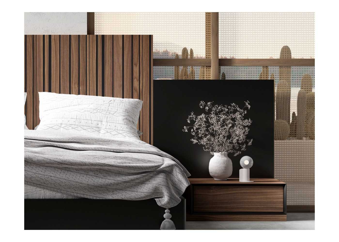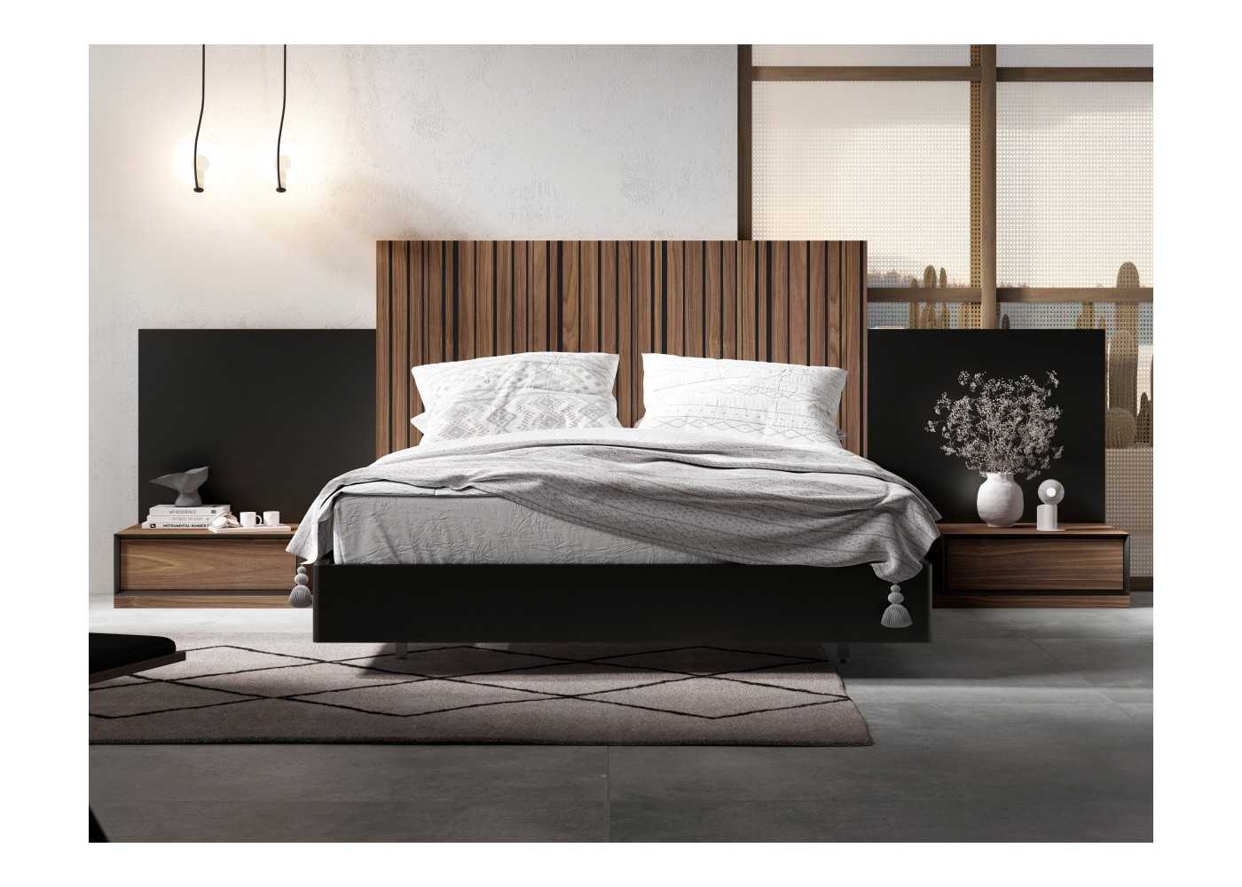 Mesitas de noche con cantos ingletados y lacados en color negro , PUSH SYSTEM para su apertura, guías de acero inoxidable y cierre SOFT CLOSING con frentes chapados en nogal americano. Posibilidad de diferentes chapas. Ver PDF de acabados.