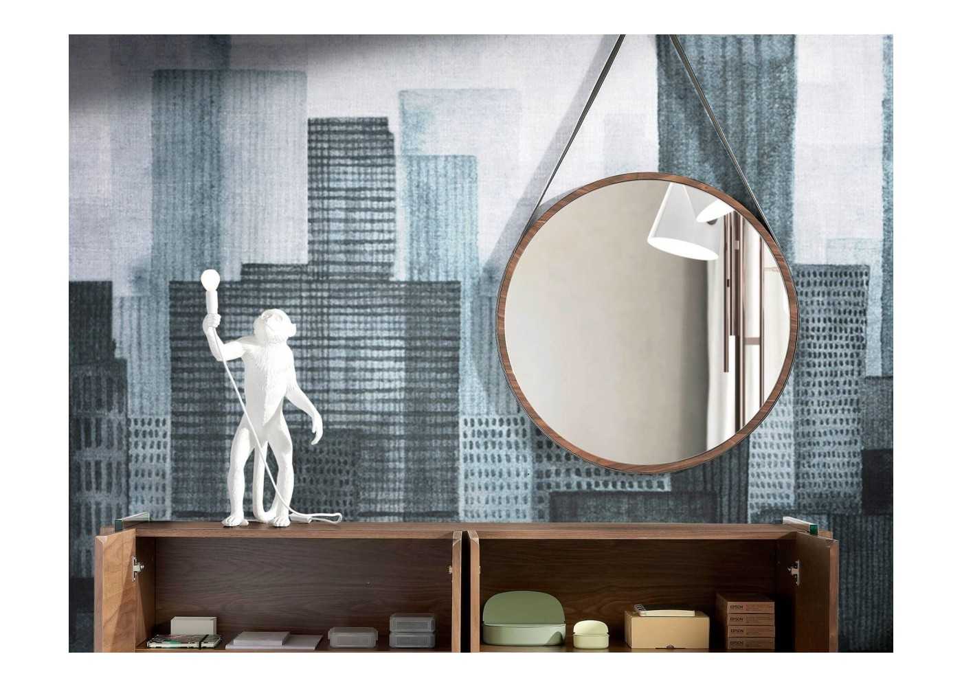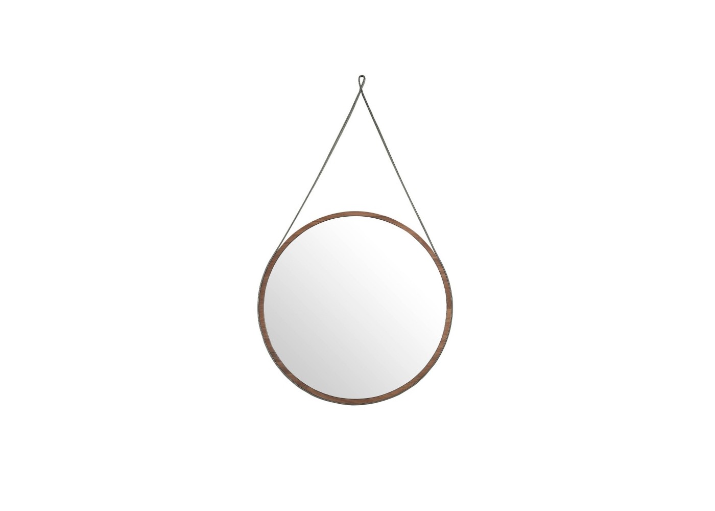 Espejo redondo colgado a pared con marco en madera de nogal y cinta de piel genuina en color chocolate
