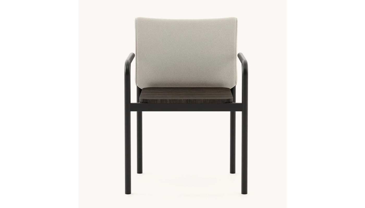 Silla de exterior con brazos y estructura en acero inoxidable texturizado con respaldo tapizado.
