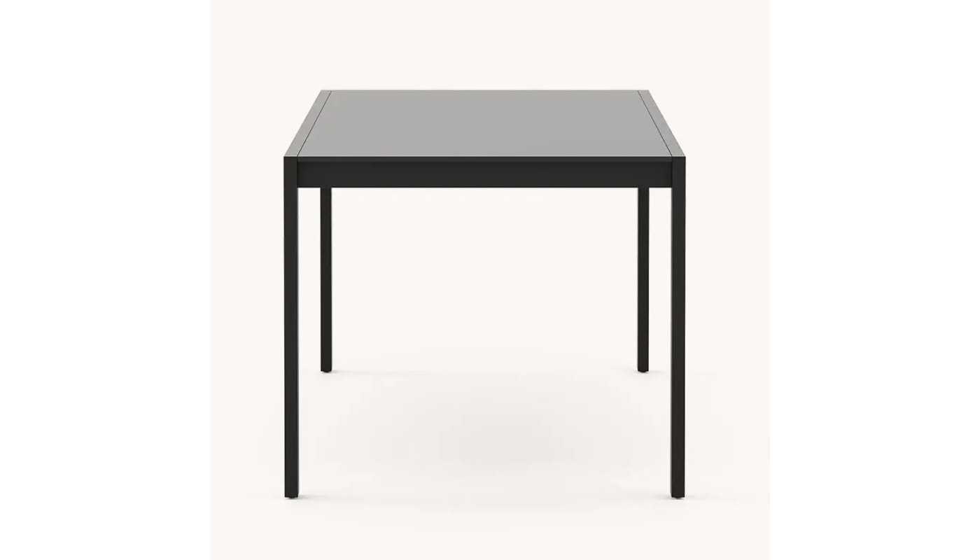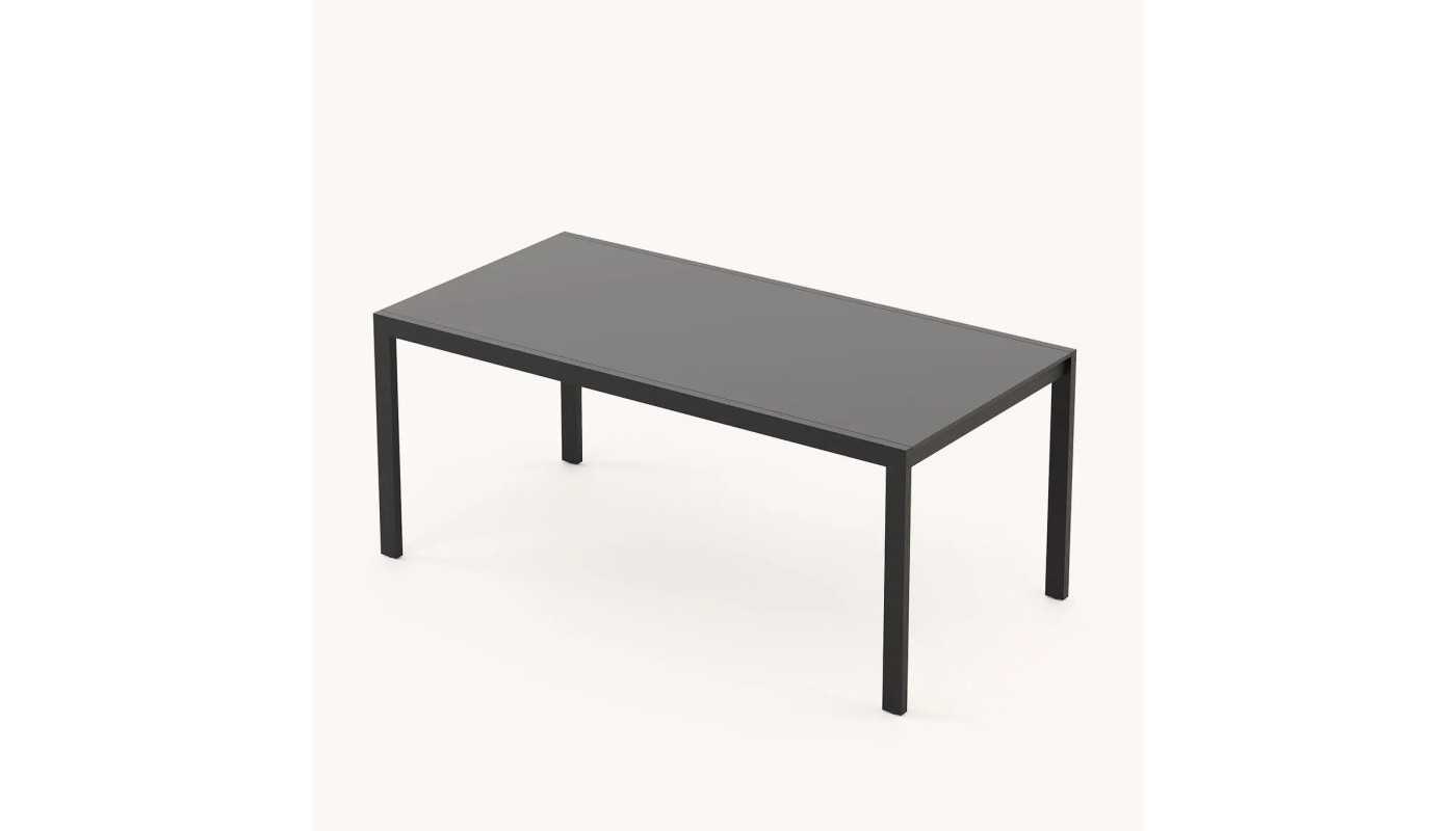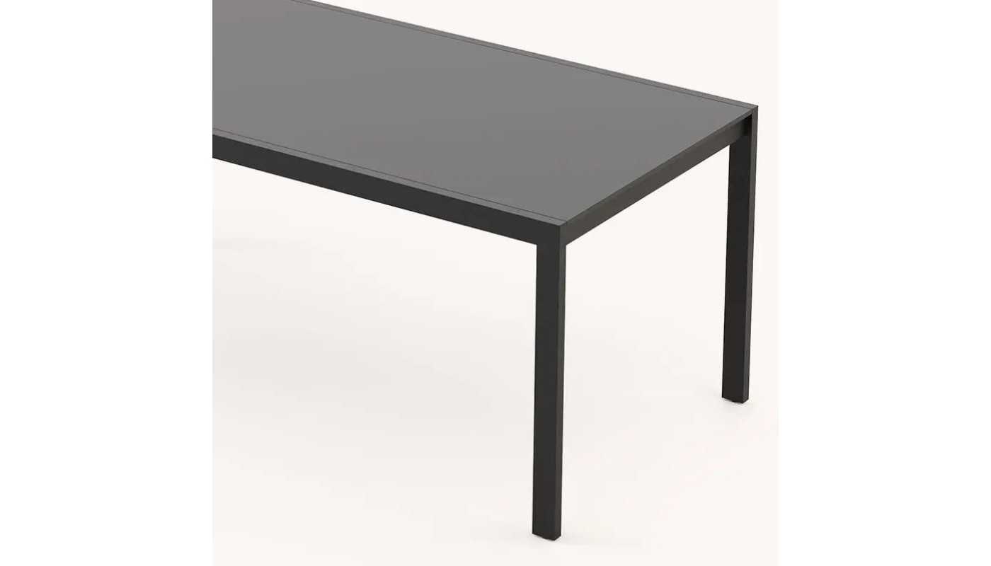 Mesa de comedor para exterior con estructura en acero inoxidable texturizado y tapa en HLP color negro