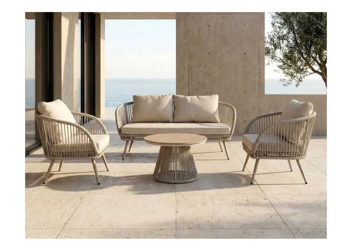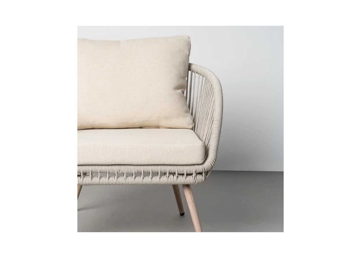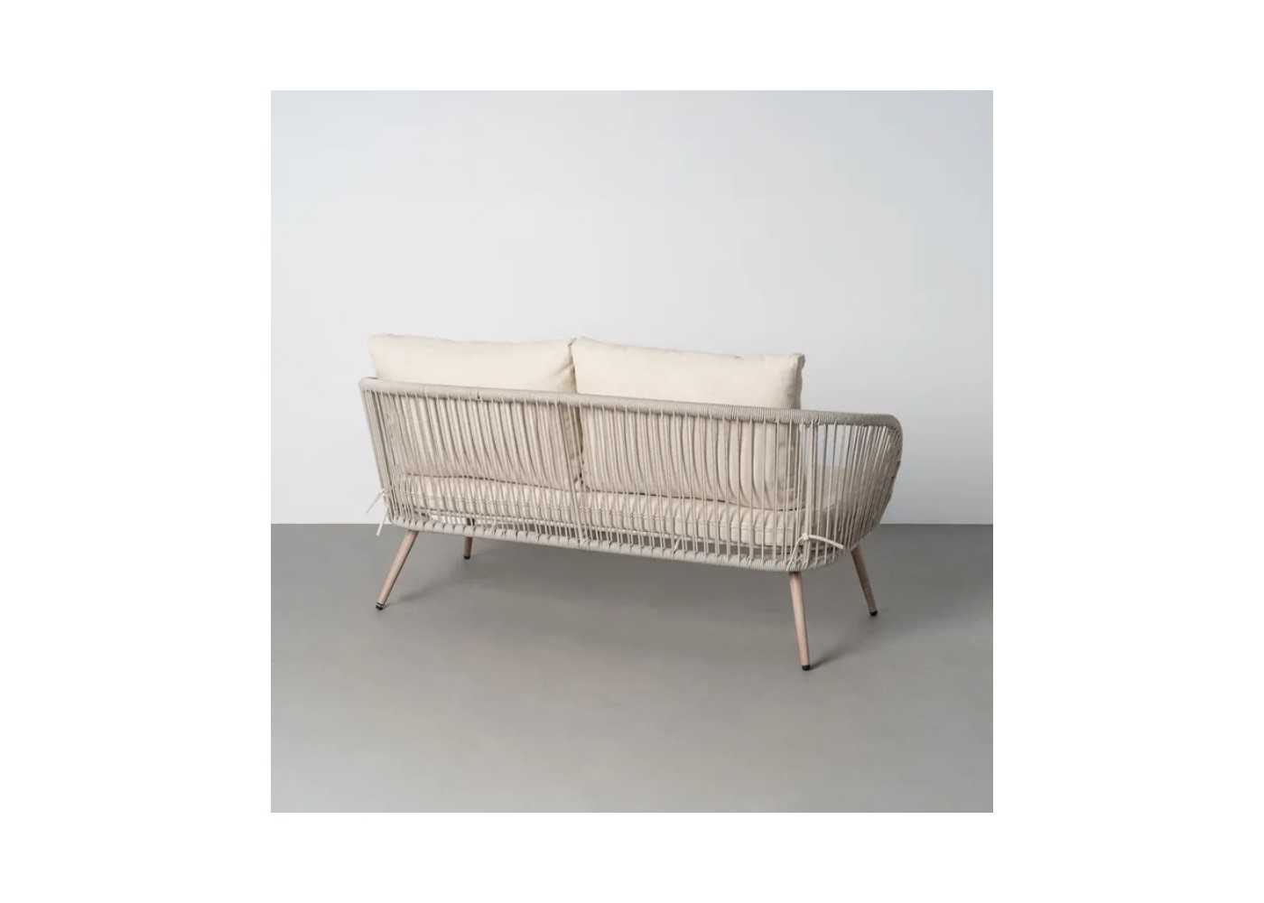 Conjunto de jardín formado por mesa de centro, sofá y dos sillones en acero lacado y ratán PE.