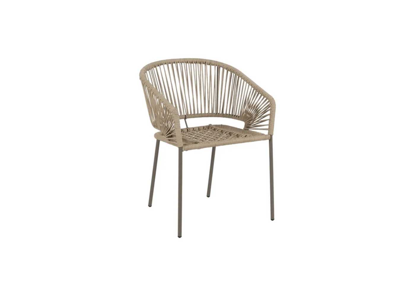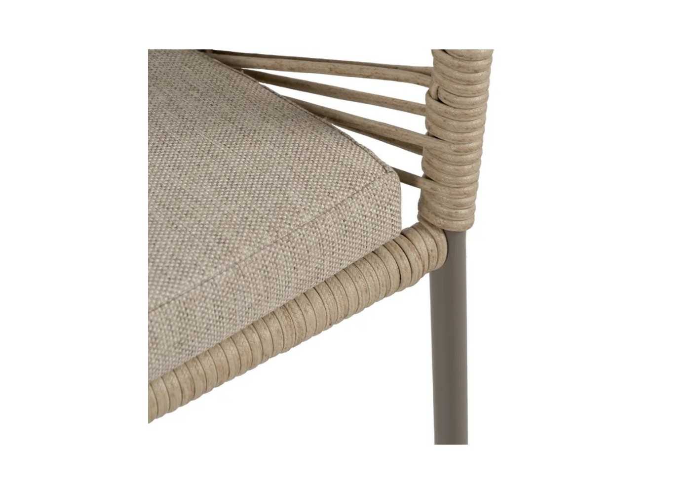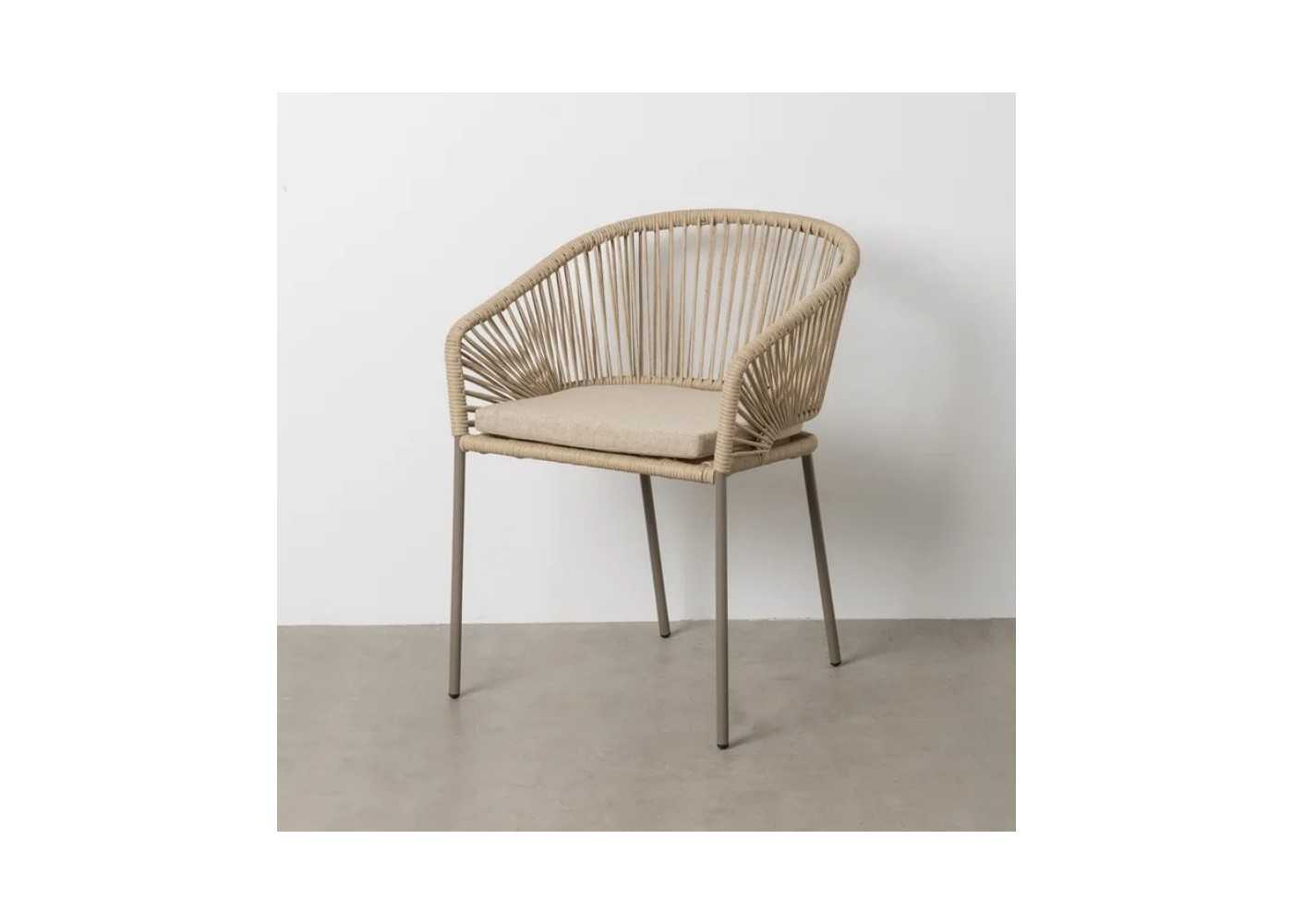 Original silla de exterior y respaldo redondeado con reposabrazos y cojín. Fabricada en aluminio con asiento y respaldo de cordaje de polietileno en color natural.