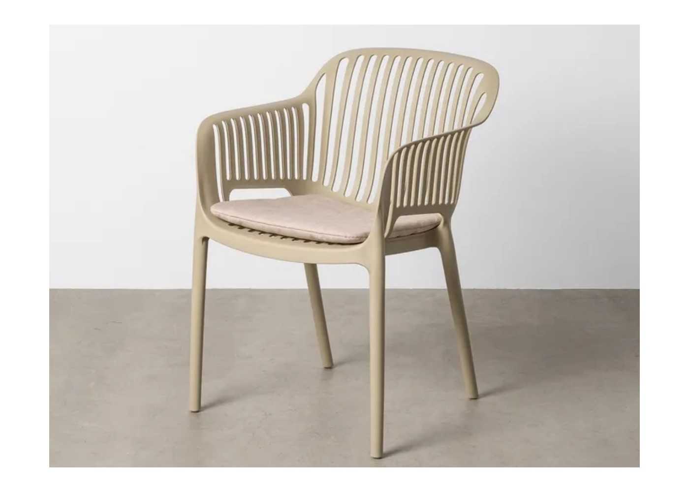 Silla para exterior con reposabrazos y apilable con cojín de asiento en color CAQUI.