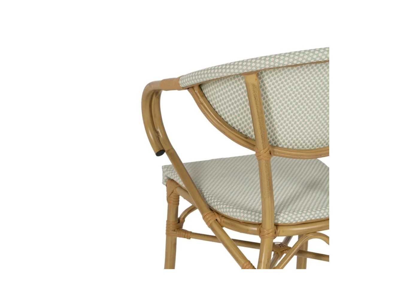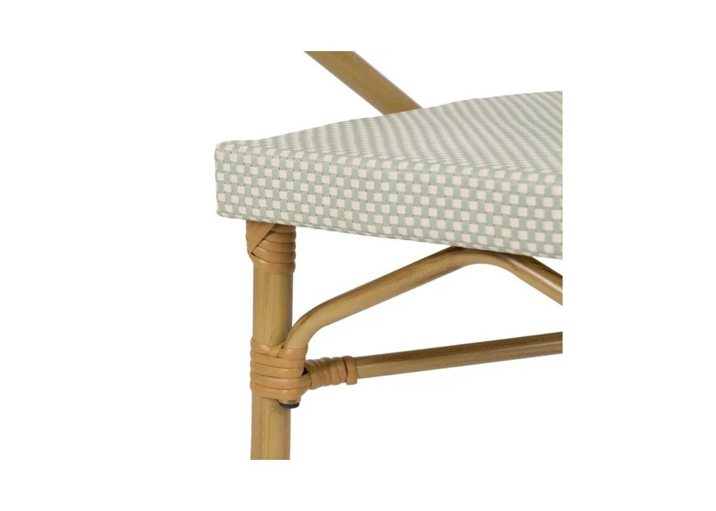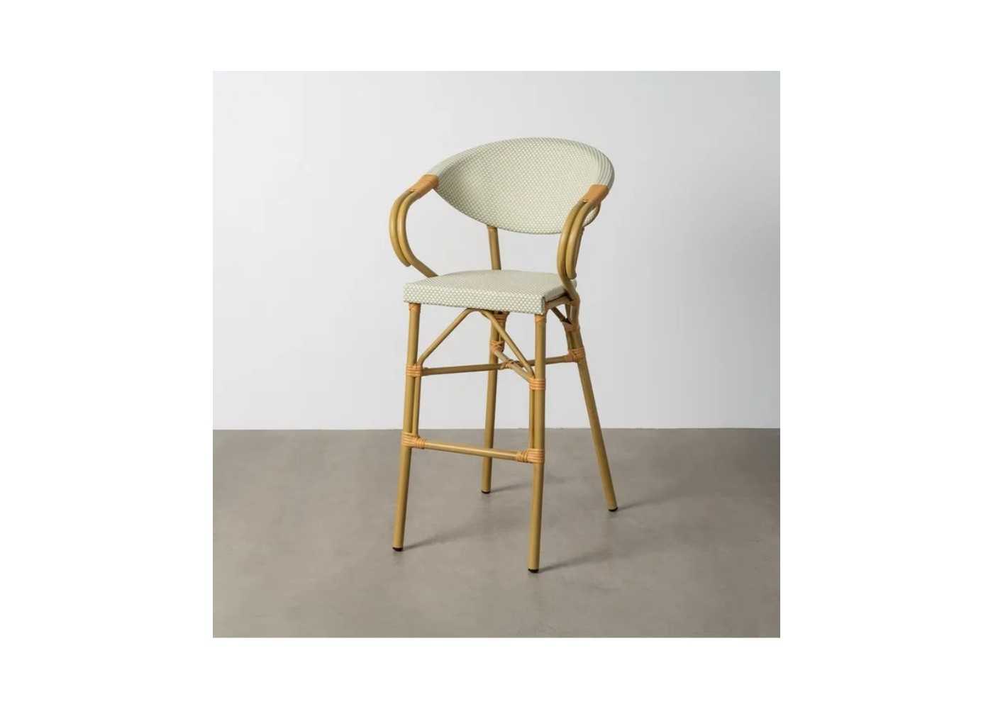 Original y confortable taburete de exterior con brazos fabricada en aluminio simulando al bambú color natural con detalles de ratán sintético.