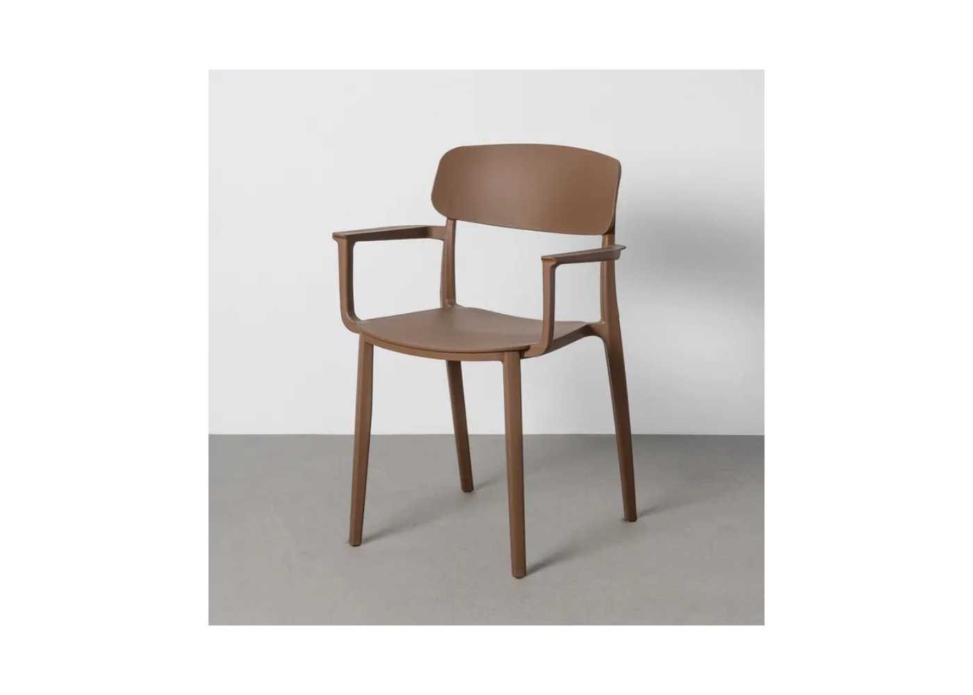 Silla para exterior con reposabrazos y apilable en color marrón.