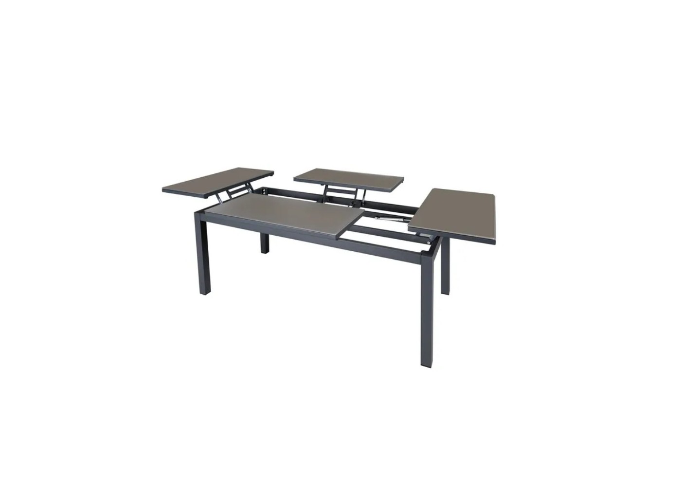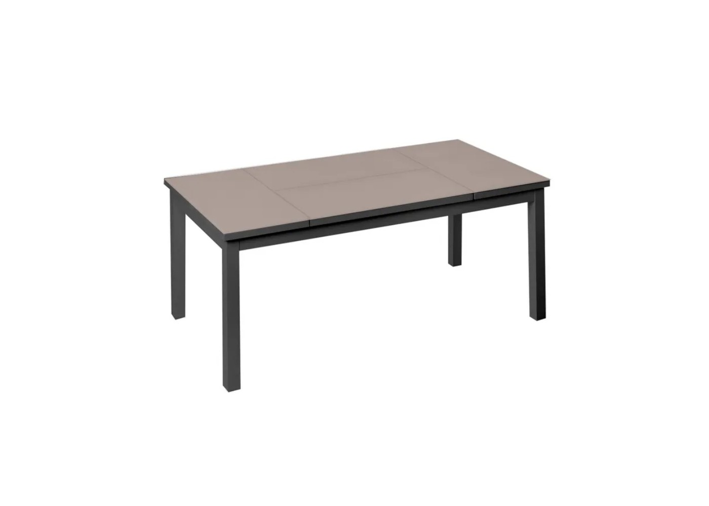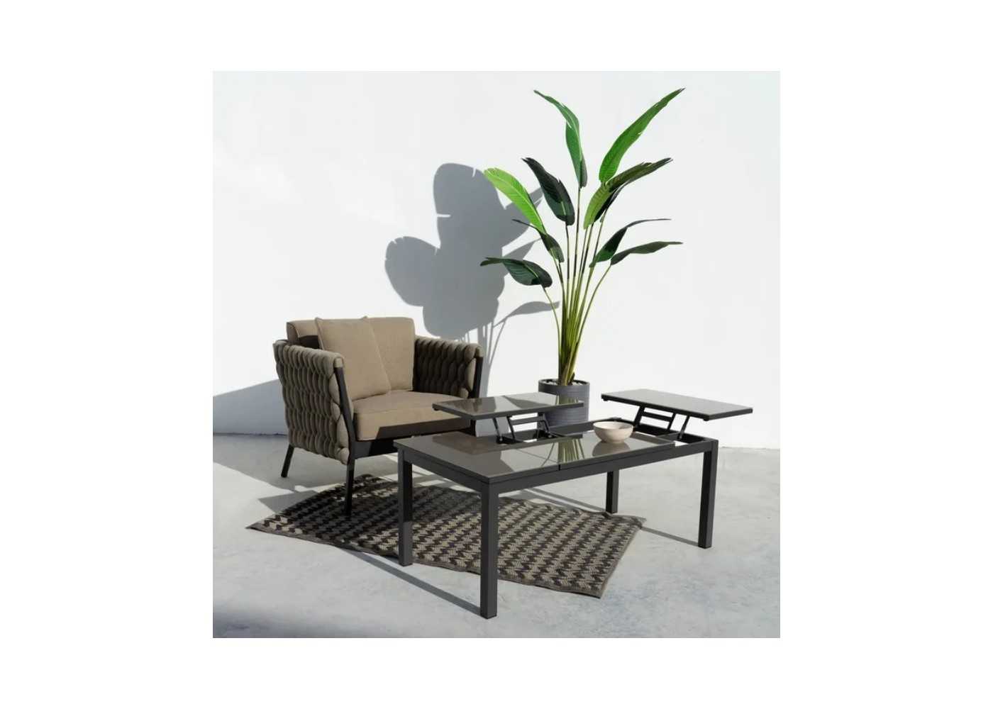Mesa de centro para exterior abatible con estructura de aluminio color grafito y tapas de cristal templado en color TAUPE.
