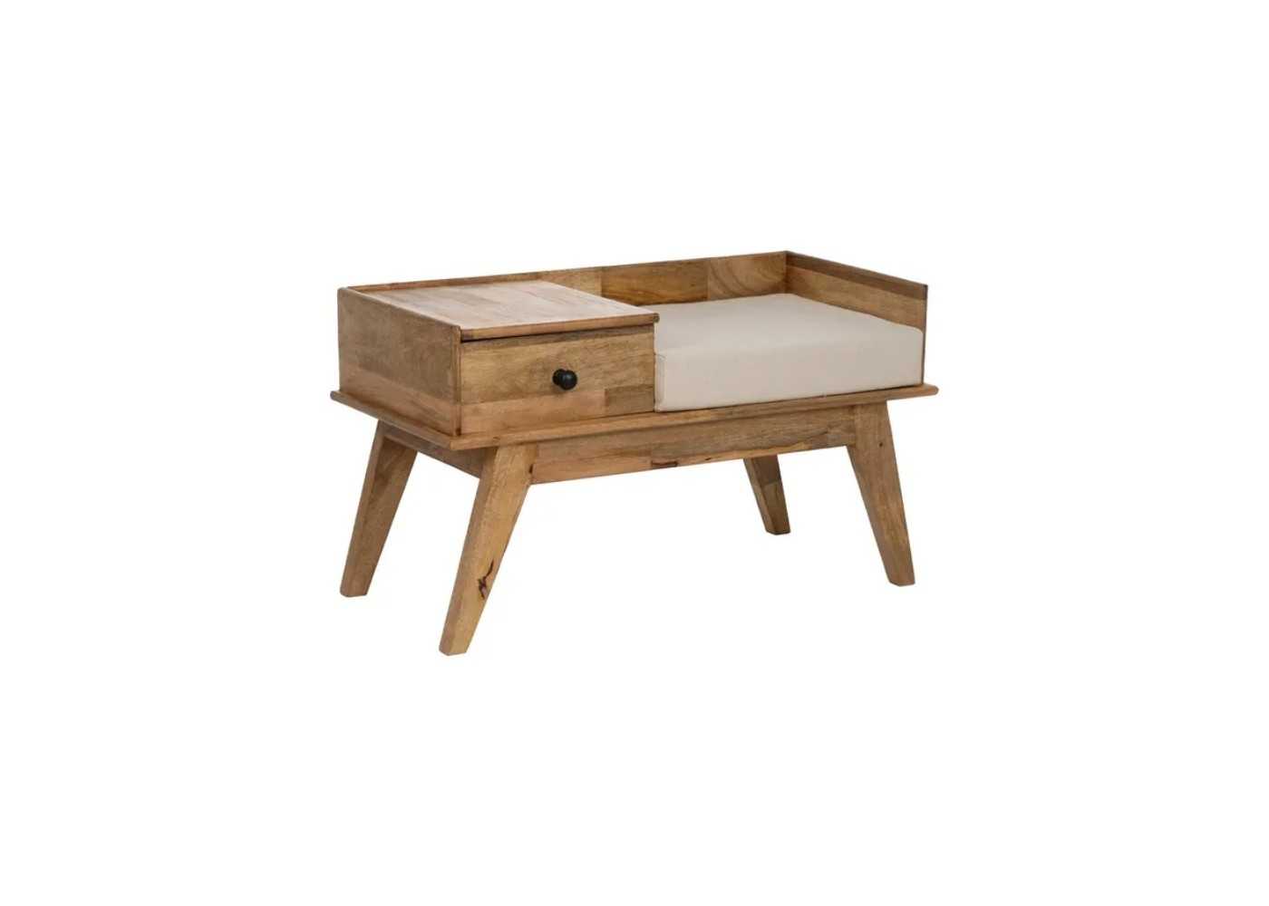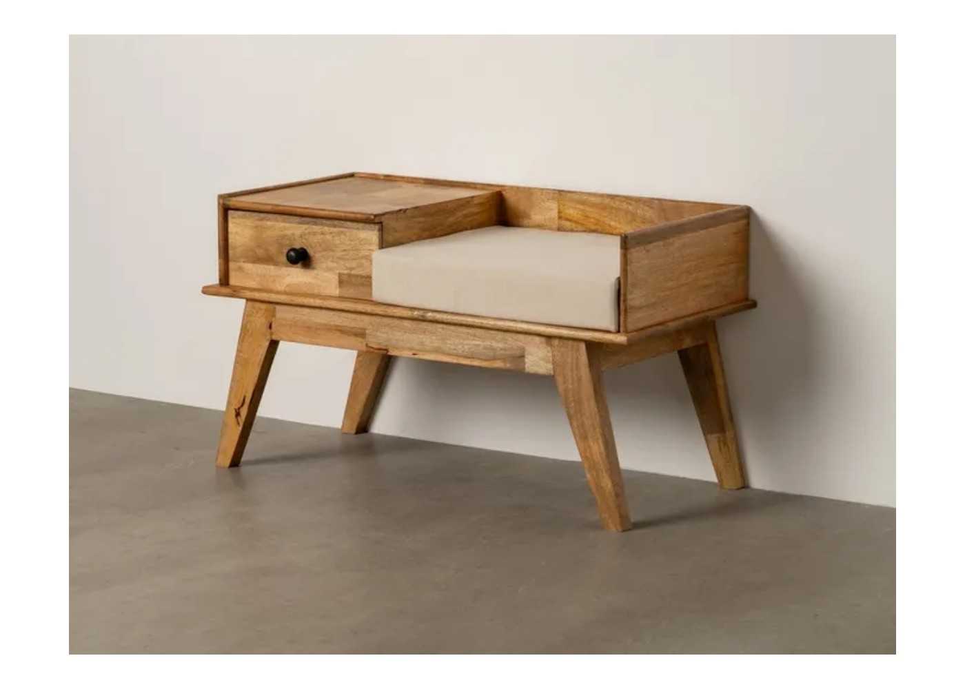 Original banqueta telefonera con asiento tapizado y cajón fabricada en madera maciza de mango.