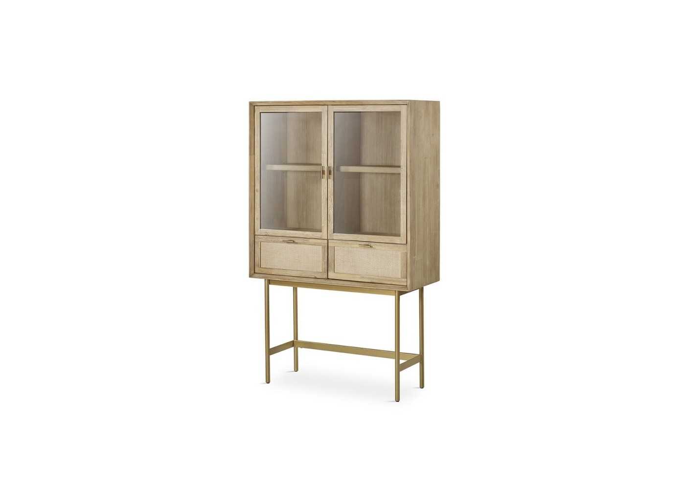 Dispone de 2 puertas con frente de cristal transparente y apertura con original tirador de acero dorado. 2 cajones inferiores con frentes enmarcados de fibra natural de ratán.